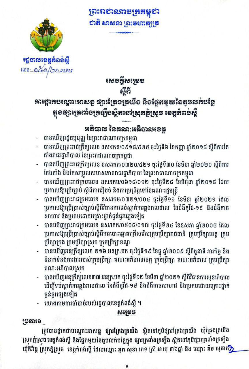 ខេត្តកំពង់ស្ពឺ៖ យោងតាមសារលិខិតរបស់ រដ្ឋបាលខេត្តកំពង់ស្ពឺ បានចេញសេចក្តីសម្រេច ស្តីពីការផ្អាកបណ្ដោះអាសន្ន ផ្សារត្រែងត្រយឹង និងផ្នែកមួយនៃតូបលក់បន្លែ ក្នុងផ្សារត្រពាំងក្រឡឹង ស្ថិតនៅក្នុងស្រុកភ្នំស្រួច ខេត្តកំពង់ស្ពឺ និងផ្នែកមួយនៃតូបលក់បន្លែក្នុង ផ្សារត្រពាំងក្រឡឹង ស្ថិតនៅភូមិផ្សារត្រពាំងក្រឡឹង ឃុំគិរីវន្ត ស្រុកភ្នំស្រួច ខេត្តកំពង់ស្ពឺ។