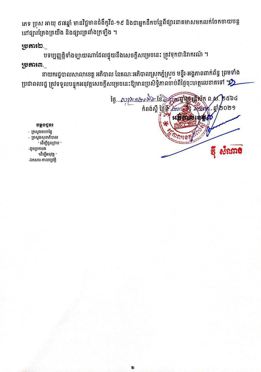 រដ្ឋបាលខេត្តកំពង់ស្ពឺ សម្រេចផ្អាកផ្សារត្រែងត្រយឹង និងផ្នែកតូបលក់បន្លែក្នុងផ្សារត្រពាំងក្រឡឹងជាបណ្ដោះអាសន្ន ក្រោយរកឃើញអ្នកជំងឺកូវីដ១៩ ចំនួន២នាក់ ជាអ្នកដឹកបន្លែពីផ្សារនាគមាសមកលក់ក្នុងផ្សារនេះ