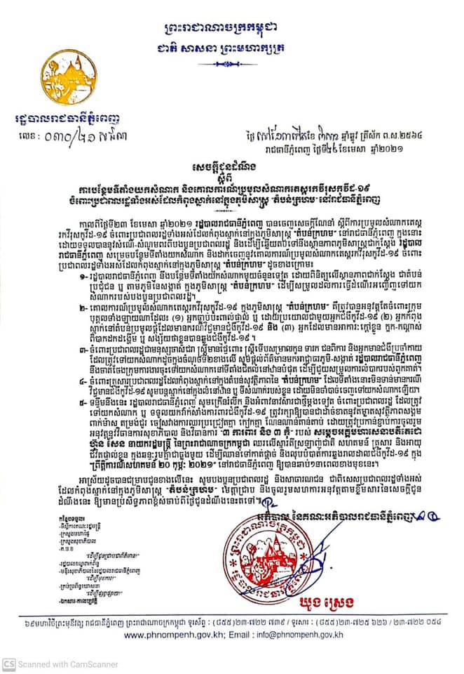 យោងតាមសេចក្តីជូនដំណឹងរបស់រដ្ឋបាលរាជធានីភ្នំពេញ លេខ ០៣០/២១ សជណ ចុះថ្ងៃទី២៤ ខែមេសា ឆ្នាំ២០២១ បានធ្វើការកែសម្រួលលក្ខខណ្ឌមួយចំនួនជុំវិញការយកសំណាកប្រជាពលរដ្ឋដែលស្នាក់នៅក្នុងតំបន់ក្រហម ដោយទទួលបាននូវសំណើ-សំណូមពរពីបងប្អូនប្រជាពលរដ្ឋ និងដើម្បីឆ្លើយតបទៅនឹងស្ថានភាពភូមិសាស្ត្រជាក់ស្តែងនៅក្នុងតំបន់ក្រហមនោះផ្ទាល់។