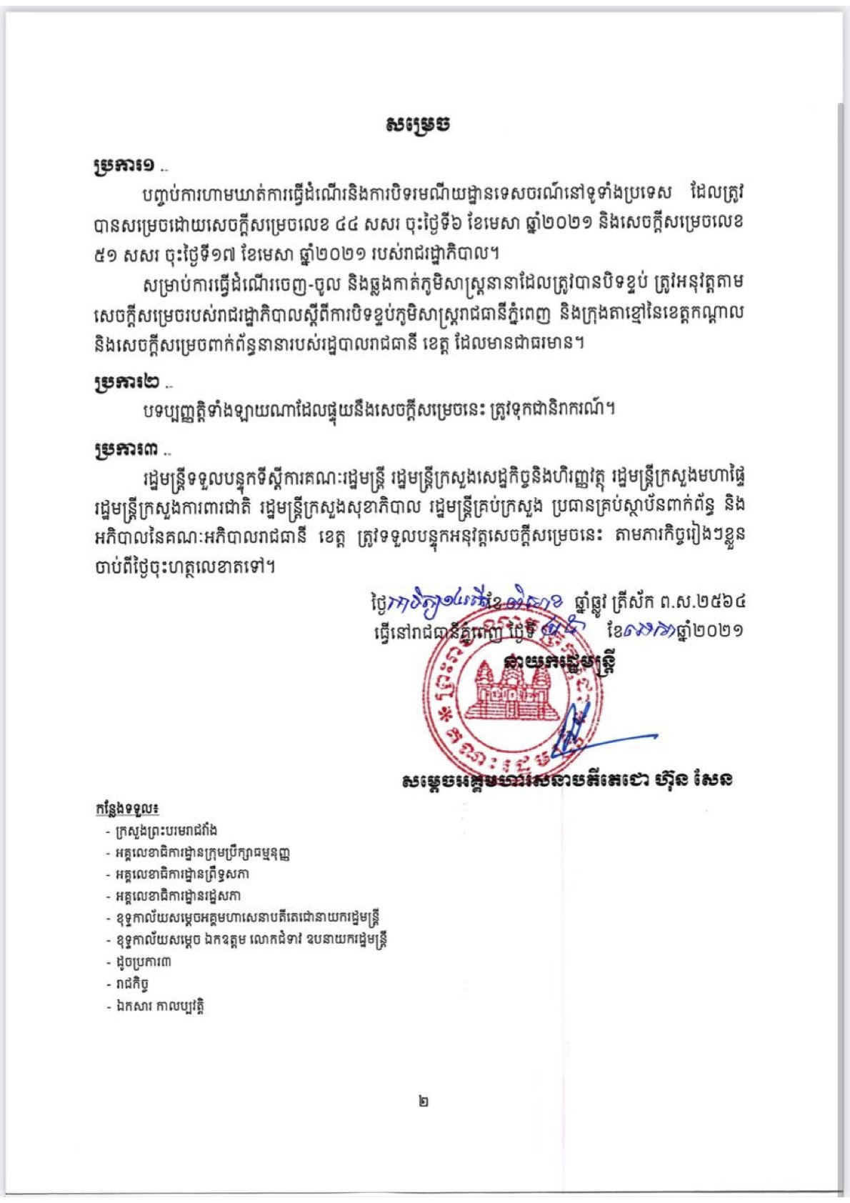 យោងតាមសេចក្តីសម្រេចរបស់រាជរដ្ឋាភិបាល ចុះថ្ងៃទី២៥ ខែមេសា ឆ្នាំ២០២១ បានសម្រេចធ្វើការបញ្ចប់ការហាមឃាត់ការធ្វើដំណើរ និងការបិទរមណីយដ្ឋានទេសចរណ៍នៅទូទាំងប្រទេស ដែលត្រូវសម្រេចដោយសេចក្តីសម្រេចលេខ ៤៤ សសរ ចុះថ្ងៃទី៦ ខែមេសា ឆ្នាំ២០២១ និងសេចក្តីសម្រេចលេខ ៥១ សសរ ចុះថ្ងៃទី១៧ ខែមេសា ឆ្នាំ២០២១ របស់រាជរដ្ឋាភិបាល។