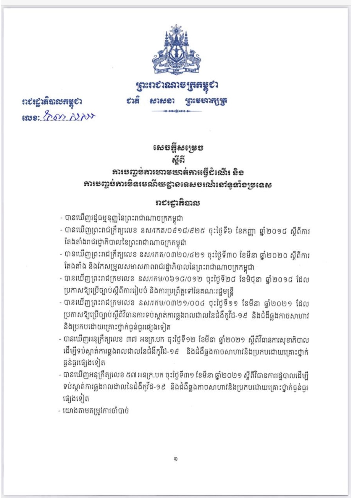 រាជរដ្ឋាភិបាល សម្រេចធ្វើការបញ្ចប់ការហាមឃាត់ការធ្វើដំណើរ និងបញ្ចប់ការបិទរមណីយដ្ឋានទេសចរណ៍នៅទូទាំងប្រទេស