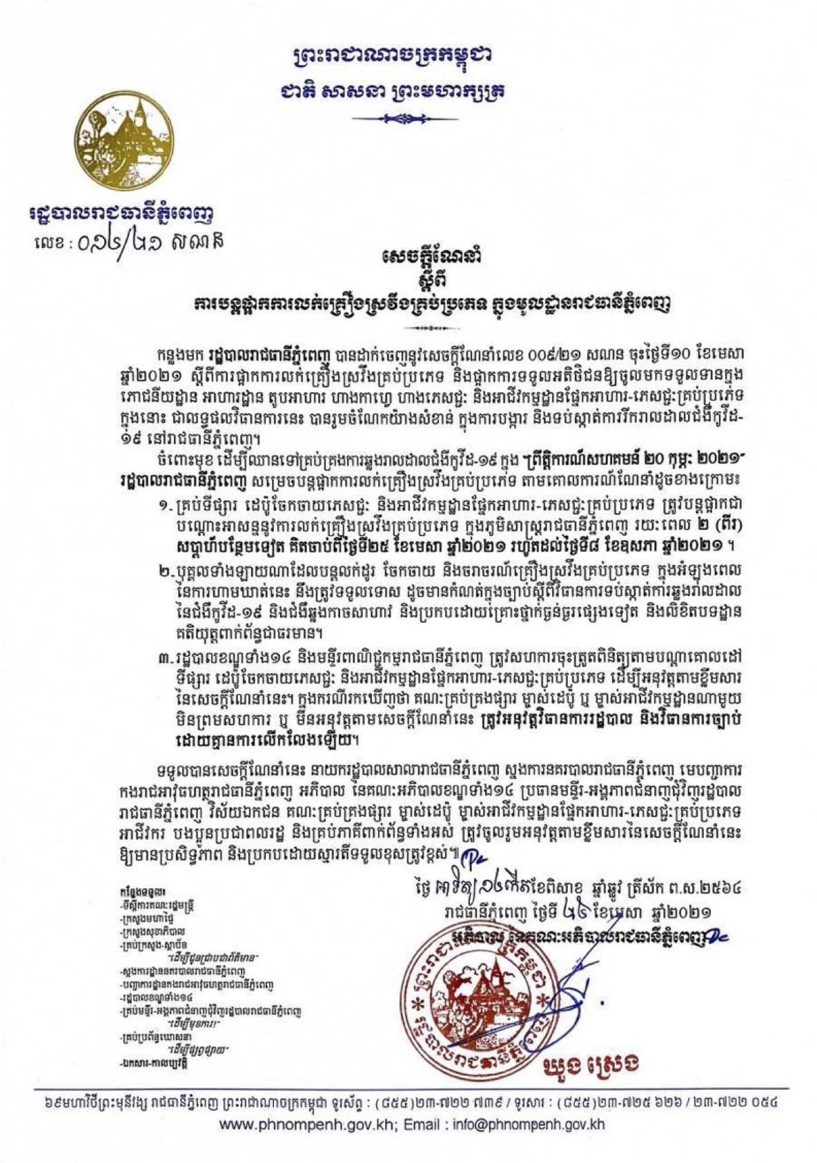 យោងតាមសេចក្តីណែនាំរបស់រដ្ឋបាលរាជធានីភ្នំពេញ បានឲ្យដឹងថា ដើម្បីឈានទៅគ្រប់គ្រងការឆ្លងរាលដាលជំងឺកូវីដ១៩ ក្នុង ព្រឹត្តិការណ៍សហគមន៍២០កុម្ភៈ ២០២១ រដ្ឋបាលរាជធានីភ្នំពេញ សម្រេចផ្អាកការលក់គ្រឿងស្រវឹងគ្រប់ប្រភេទរយៈពេល២សប្តាហ៍បន្ថែមទៀត គិតចាប់ពីថ្ងៃទី២៥ ខែមេសា រហូតដល់ថ្ងៃទី០៨ ខែឧសភា ឆ្នាំ២០២១។ សូមអានព័ត៌មានលំអិតខាងក្រោម៖