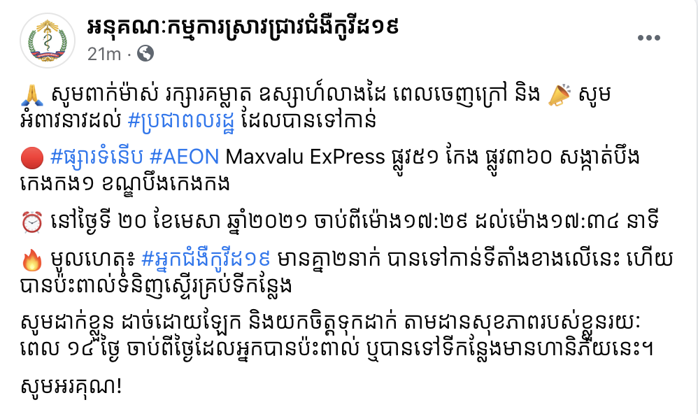យោងតាមការបញ្ជាក់ពី អនុគណៈកម្មការស្រាវជ្រាវជំងឺកូវីដ១៩ បានឲ្យដឹងថា សូមពាក់ម៉ាស់ រក្សារគម្លាត ឧស្សាហ៍លាងដៃ ពេលចេញក្រៅ និងសូមអំពាវនាវដល់ប្រជាពលរដ្ឋ ដែលបានទៅកាន់ផ្សារទំនើប AEON Maxvalu ExPress ផ្លូវ៥១ កែង ផ្លូវ៣៦០ សង្កាត់បឹងកេងកង១ ខណ្ឌបឹងកេងកង នៅថ្ងៃទី ២០ ខែមេសា ឆ្នាំ២០២១ ចាប់ពីម៉ោង១៧:២៩ ដល់ម៉ោង១៧:៣៤ នាទី ដោយមូលហេតុ៖ អ្នកជំងឺកូវីដ១៩ មានគ្នា២នាក់ បានទៅកាន់ទីតាំងខាងលើនេះ ហើយបានប៉ះពាល់ទំនិញស្ទើរគ្រប់ទីកន្លែង។