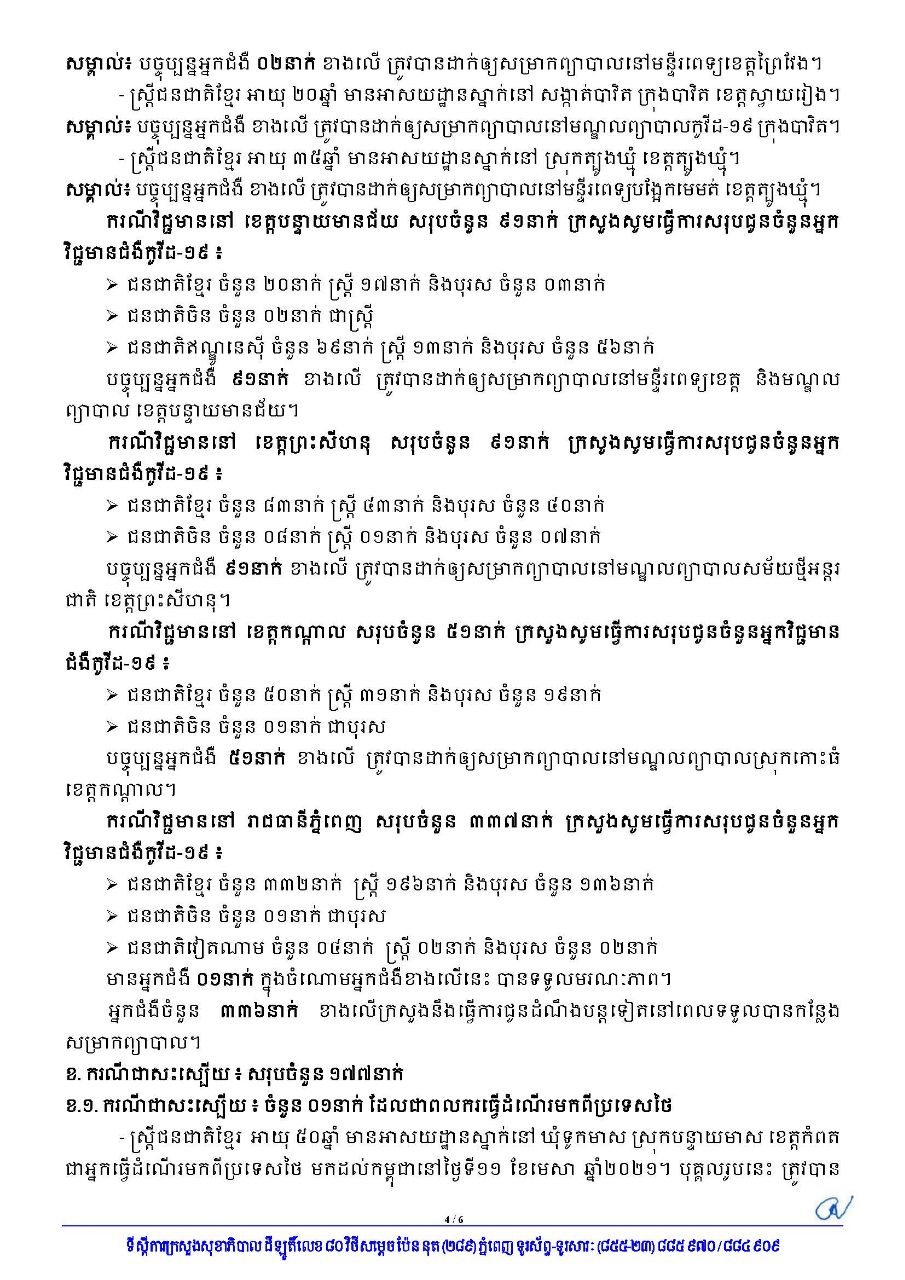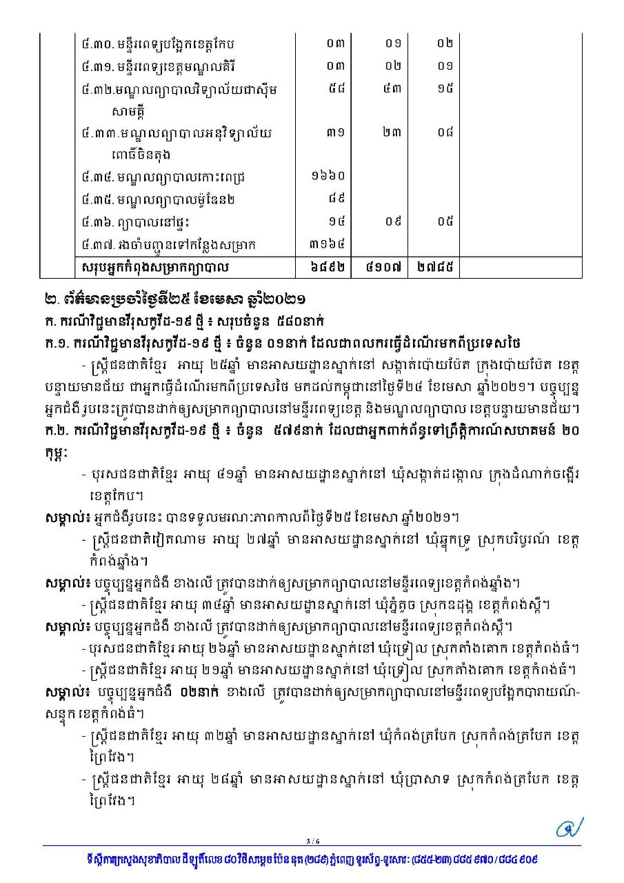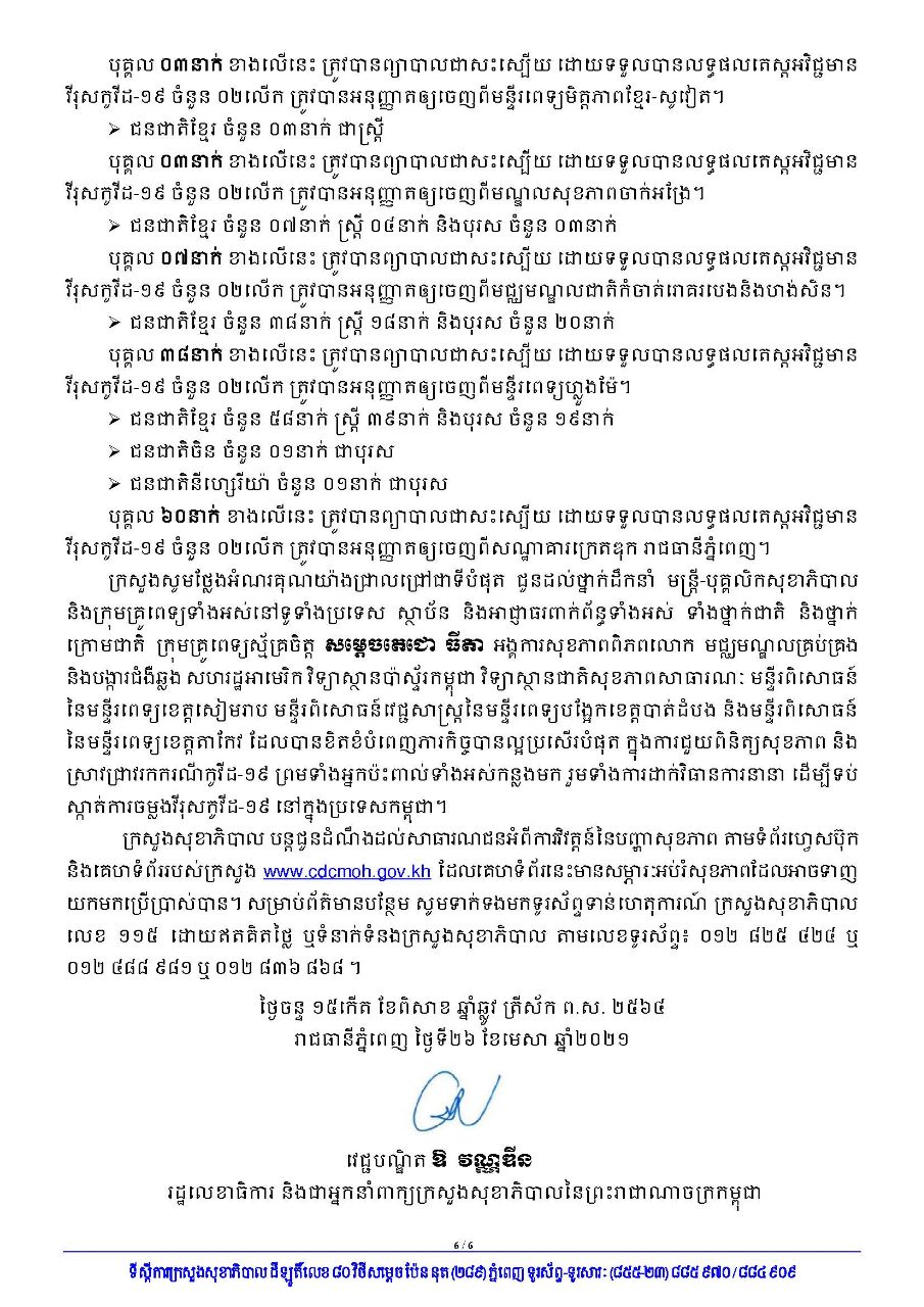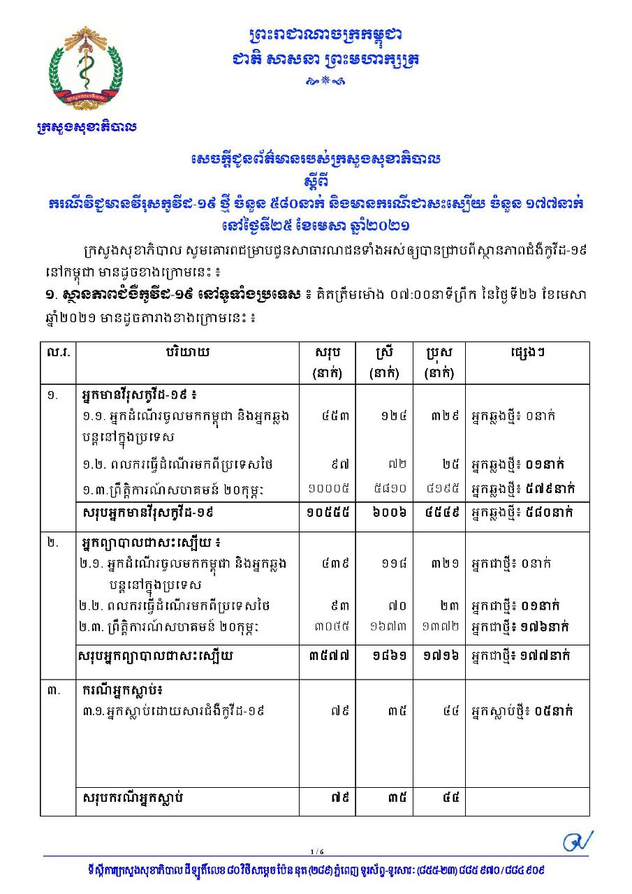 នៅថ្ងៃទី២៦ ខែមេសា ឆ្នាំ២០២១នេះ ក្រសួងសុខាភិបាលកម្ពុជា បានចេញសេចក្តីជូនដំណឹងពី ការរកឃើញករណីវិជ្ជមានវីរុសកូវីដ១៩ថ្មី ចំនួន ៥៨០នាក់ និងមានករណីជាសះស្បើយថ្មីចំនួន ១៧៧នាក់ផងដែរ ខណៈអ្នកឆ្លងក្នុងព្រឹត្តិការណ៍សហគមន៍២០កុម្ភៈ កើនដល់ ១ម៉ឺន ៥នាក់ ជាចំនួនមិនធ្លាប់មានពីមុនមក។