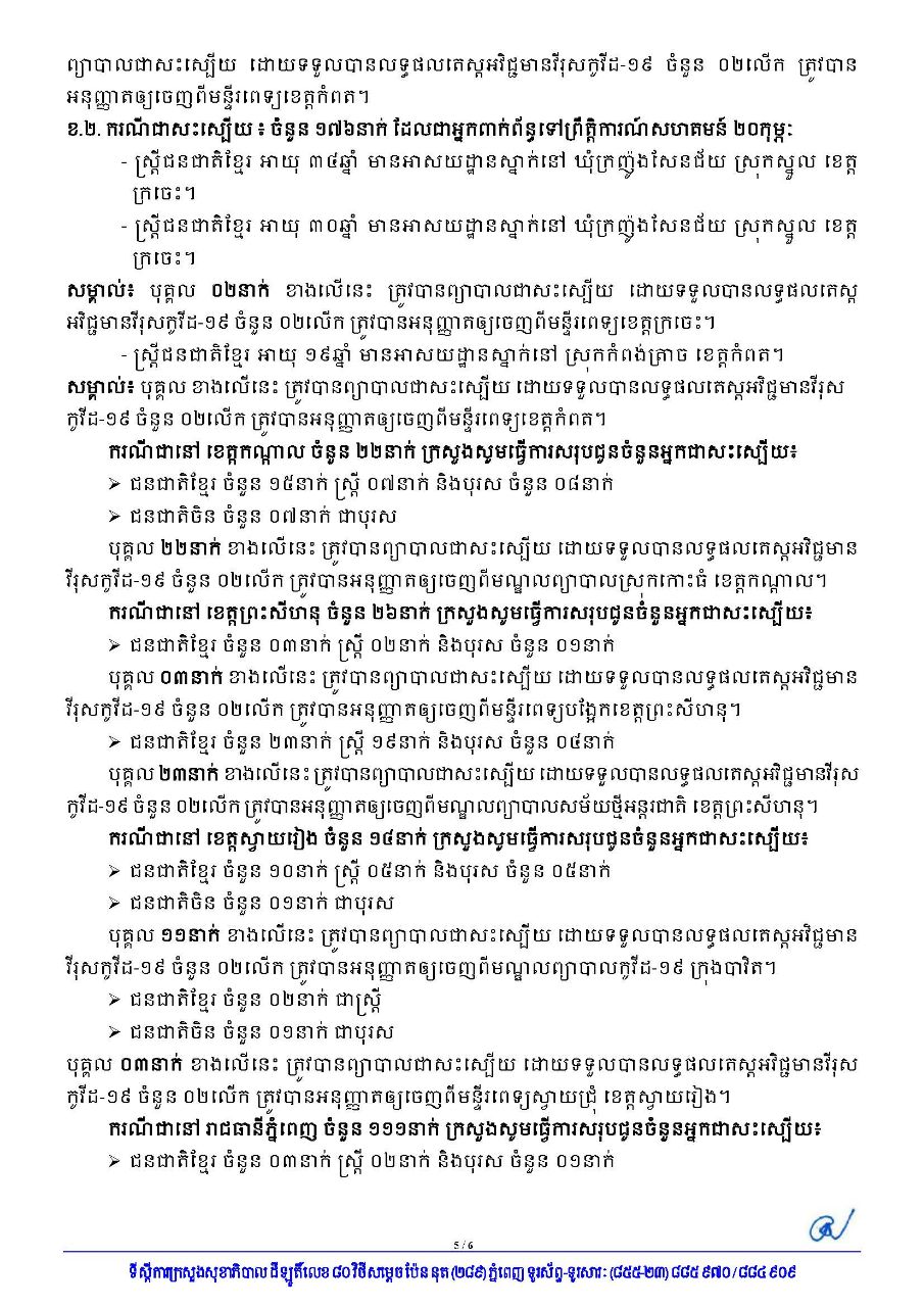 យោងតាមសេចក្តីប្រកាសរបស់ក្រសួងសុខាភិបាល បានបញ្ជាក់ថា អ្នកវិជ្ជមានទាំង៥៨០នាក់នោះ គឺមាន០១នាក់ជា ពលករធ្វើដំណើរមកពីប្រទេសថៃ និង៥៧៩ នាក់ទៀត ជាអ្នកពាក់ព័ន្ធព្រឹត្តិការណ៍ សហគមន៍២០កុម្ភៈ ហើយក្នុងនោះរាជធានីភ្នំពេញ មានអ្នកឆ្លងថ្មីចំនួន ៣៣៧នាក់ ជនជាតិខ្មែរ ៣៣២នាក់ (ស្ត្រី១៩៦នាក់ និងបុរស១៣៦នាក់) ជនជាតិចិន ០១នាក់ជាបុរស និងជនជាតិវៀតណាម ០៤នាក់ បុរស០២នាក់ ស្ត្រី០២នាក់៕