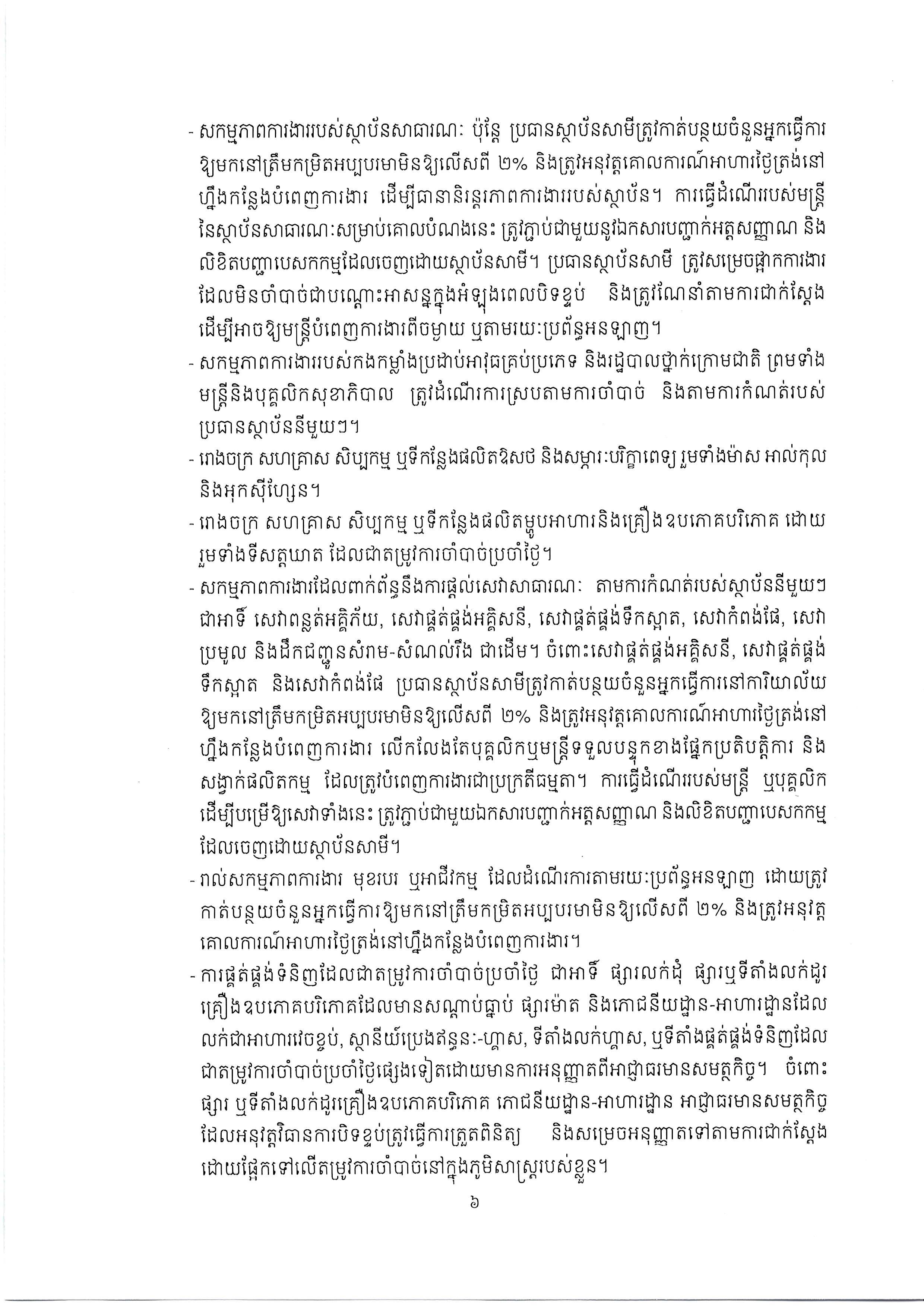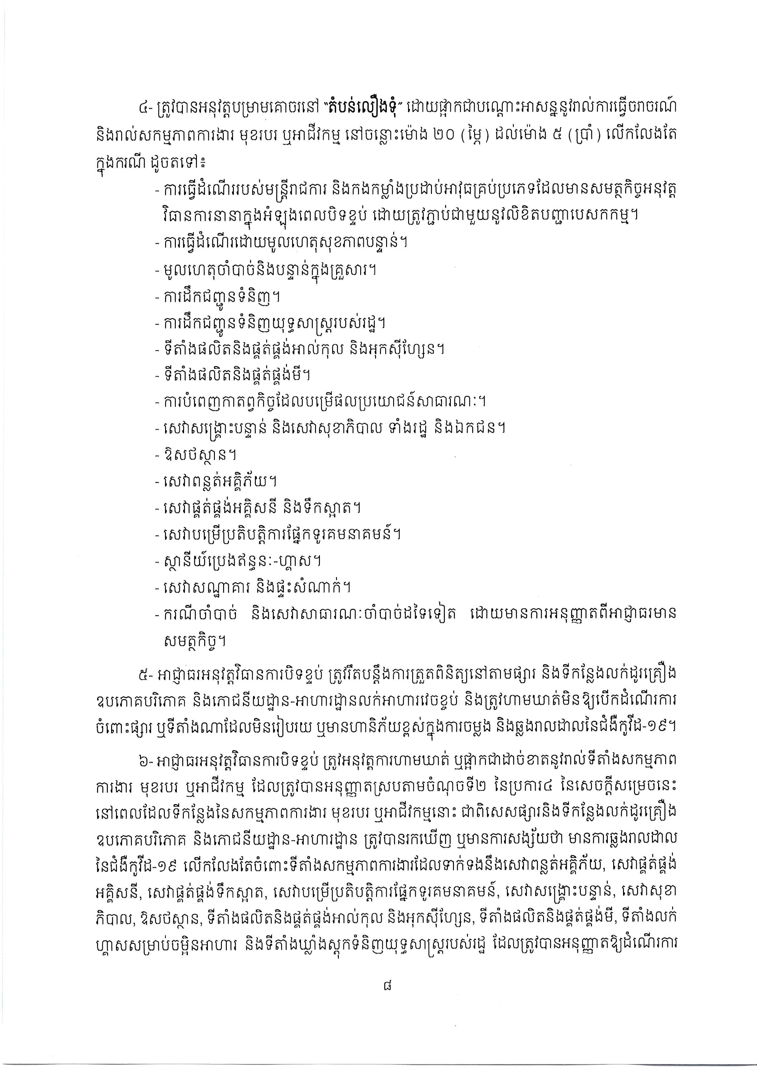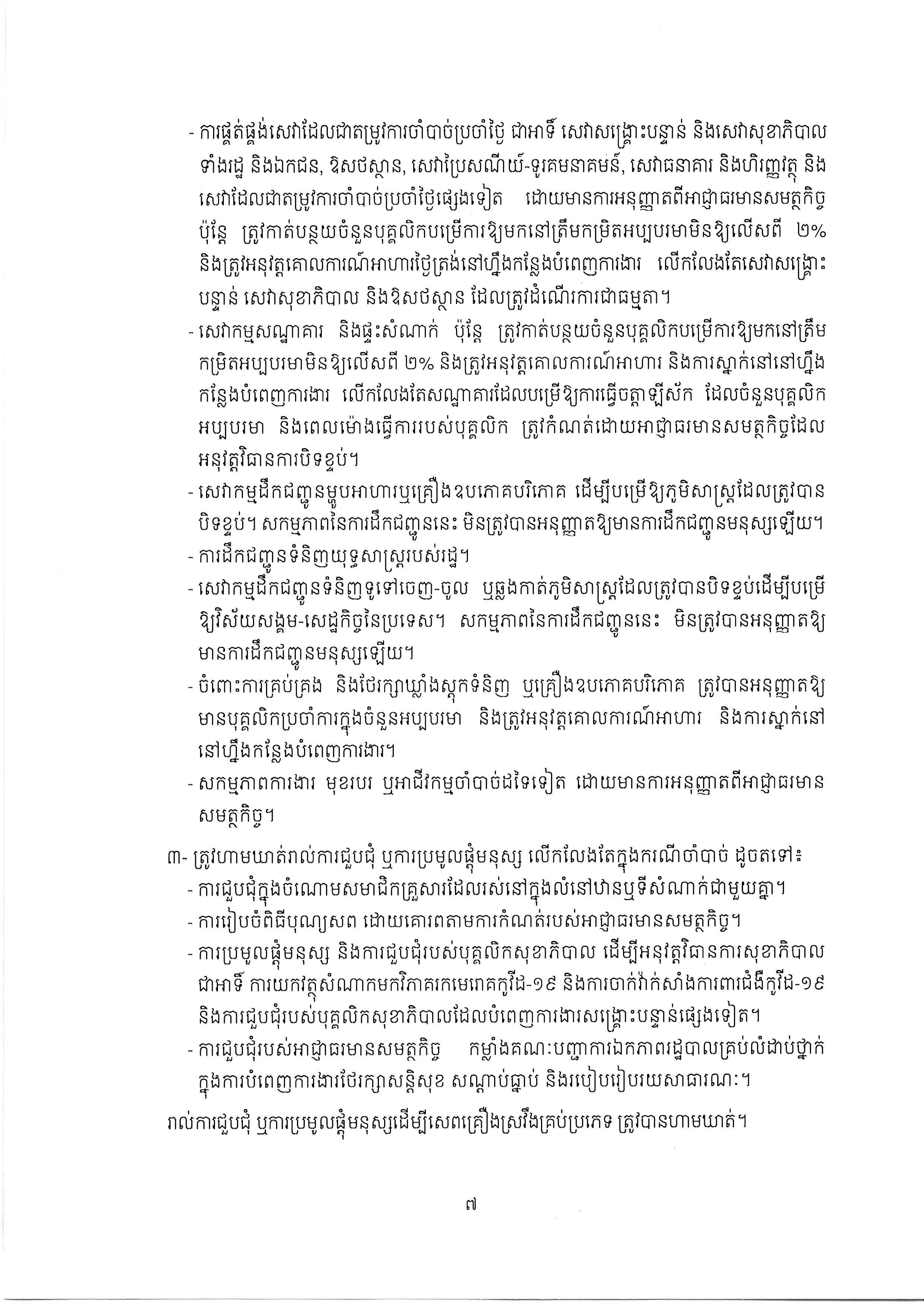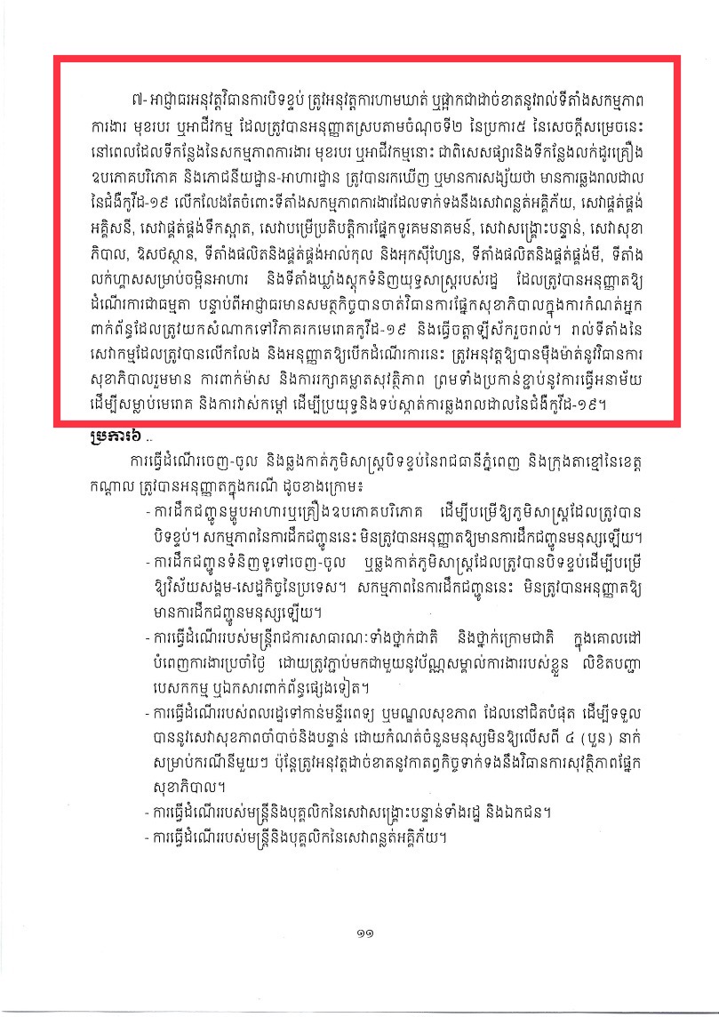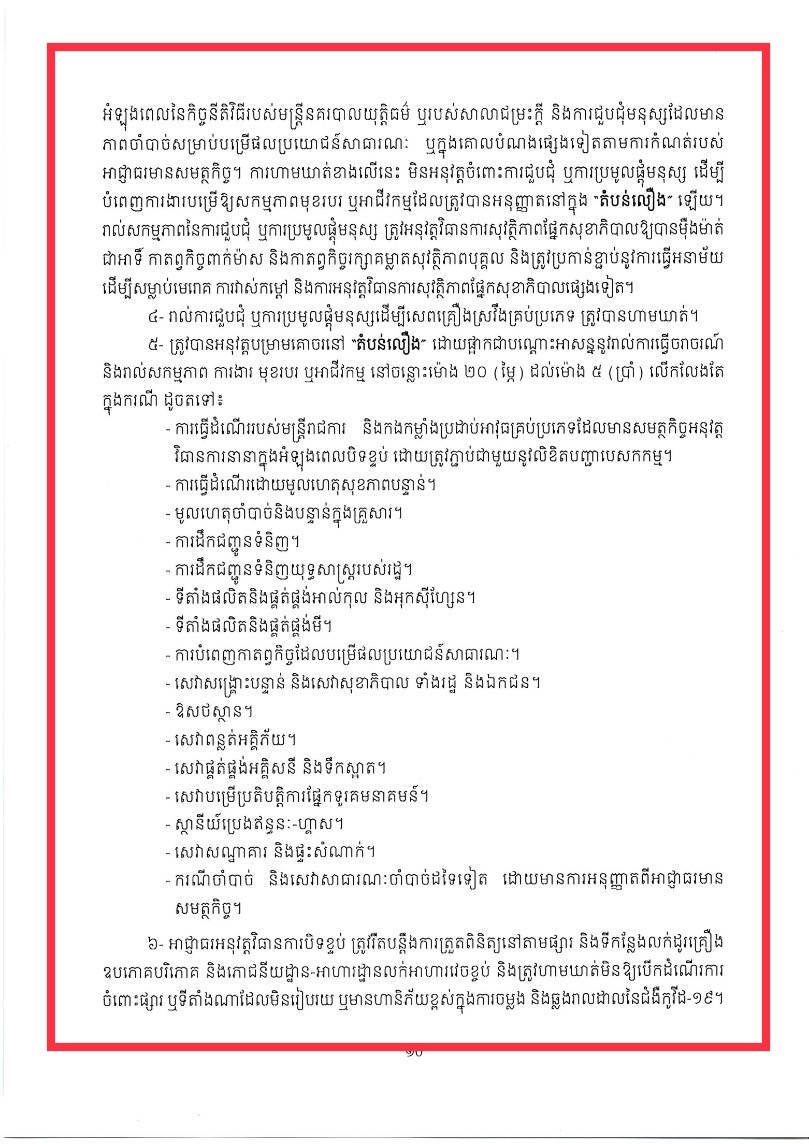 យោងតាមសេចក្តីសេចក្តីសម្រេចថ្មីរបស់រាជរដ្ឋាភិបាល លេខ ៥៤ សសរ ចុះថ្ងៃទី២៦ ខែមេសា ឆ្នាំ២០២១ ដោយសម្រេចបន្តការបិទខ្ទប់ភូមិសាស្ត្ររាជធានីភ្នំពេញ និងក្រុងតាខ្មៅ រយៈពេល ០៧ថ្ងៃបន្តទៀត រហូតដល់ថ្ងៃទី០៥ ខែឧសភា ឆ្នាំ២០២១។