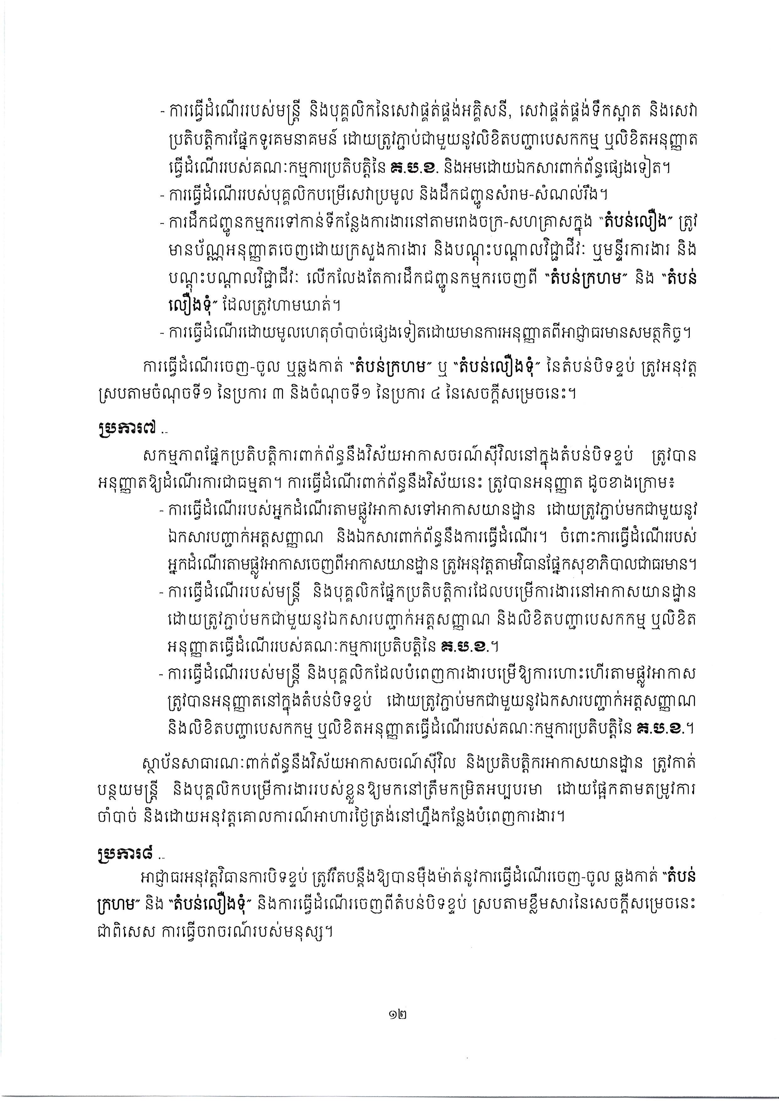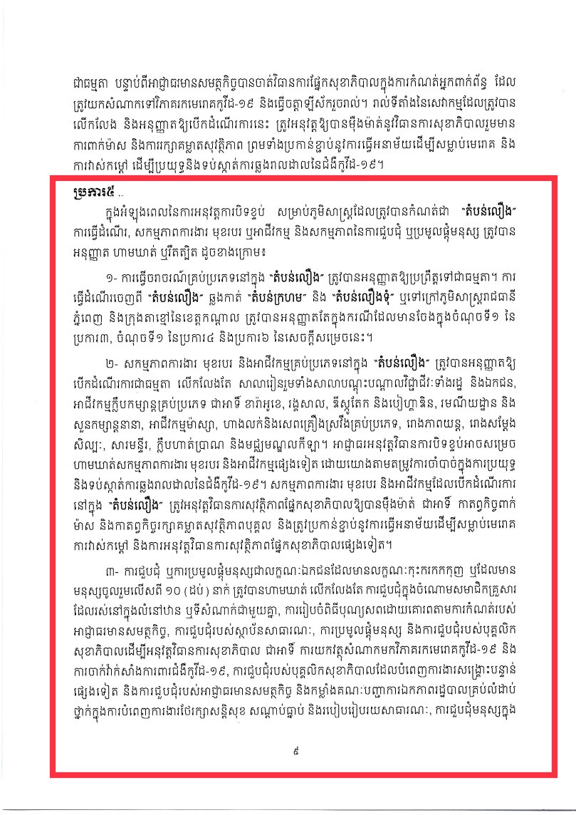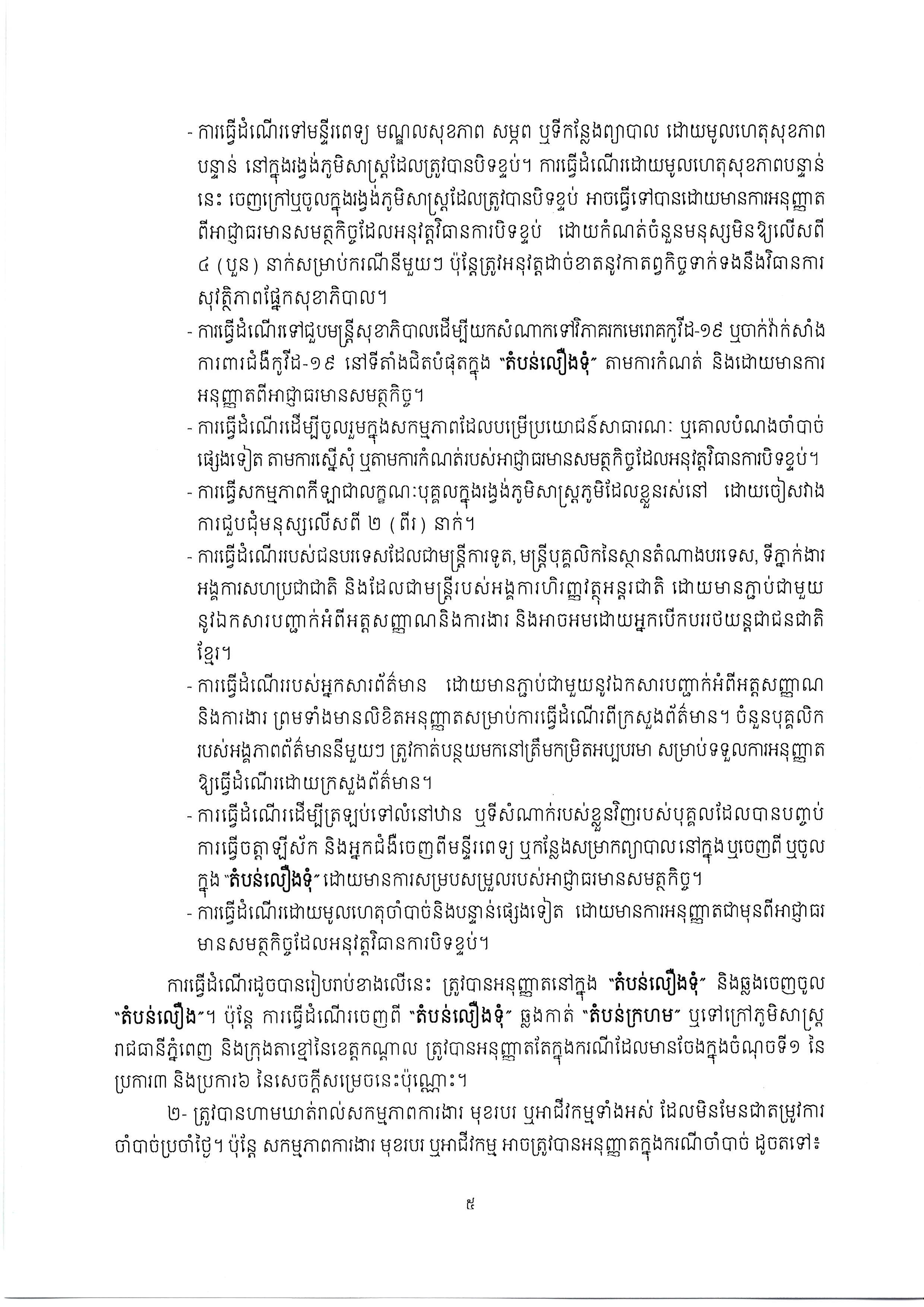 ក្នុងសេចក្តីសម្រេចដដែលនេះដែរ បានធ្វើការបែកចែកតំបន់ជា៣ ដោយក្នុងនោះមានតំបន់ក្រហម(ឆ្លងរាលដាលកម្រិតធ្ងន់ធ្ងរ) តំបន់លឿងទុំ(ឆ្លងរាលដាលកម្រិតមធ្យម) និងតំបន់លឿង(ឆ្លងរាលដាលកម្រិតស្រាល)។ អ្វីដែលគួរកត់សំគាល់គឺនៅក្នុងប្រការ៥ បានចែងថា សម្រាប់អ្នករស់នៅតំបន់លឿង គឺត្រូវបានអនុញ្ញាតអោយធ្វើចរាចរណ៍គ្រប់ប្រភេទនៅក្នុងរបស់ខ្លួន ហើយបើធ្វើដំណើរឆ្លងកាត់តំបន់ក្រហម និងតំបន់លឿងទុំ អនុញ្ញាតបានតែក្នុងករណីដែលមានចែងនៅក្នុងចំណុចទី១ នៃប្រការ៣, ចំណុចទី១ នៃប្រការ៤ និងប្រការ៦ នៃសេចក្តីសម្រេចតែប៉ុណ្ណោះ។ ចំពោះបម្រាមគោចរ ដោយផ្អាកធ្វើចរាចរណ៍ និងសកម្មភាពការងារ មុខរបរ ឬអាជីវកម្ម នៅចន្លោះម៉ោង ២០ ដល់ម៉ោង ៥ភ្លឺ នៅបន្តអនុវត្តដដែល លើកលែងក្នុងករណីមួយចំនួនប៉ុណ្ណោះ។
