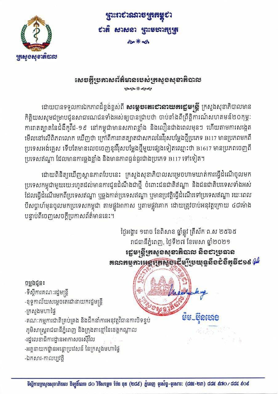 សេចក្តីប្រកាសព័ត៌មានរបស់ក្រសួងសុខាភិបាល បានឱ្យដឹងថា ដោយបានទទួលការឯកភាពដ៏ខ្ពង់ខ្ពស់ សម្តេចតេជោនាយករដ្ឋមន្ត្រី គឺចាប់តាំងពីព្រឹត្តិការណ៍សហគមន៍២០កុម្ភៈ ការរាតត្បាតនៃជំងឺកូវីដ-១៩ នៅកម្ពុជាមានសភាពខ្លាំង និងលឿនជាងពេលមុនៗ ហើយតាមការសង្កេត មើលនៅលើពិភពលោក ឃើញថា ក្រៅពីការរាតត្បាតជាសកលនៃវីរុសបម្លែងថ្មីប្រភេទ B117 មានប្រភពមកពី ប្រទេសអង់គ្លេស ទើបតែមានលេចចេញនូវវីរុសបម្លែងថ្មីមួយផ្សេងទៀតឈ្មោះថា B1 617 មានប្រភពចេញពី ប្រទេសឥណ្ឌា ដែលមានការឆ្លងខ្លាំង និងមានភាពធ្ងន់ធ្ងរជាងប្រភេទ B117 ទៅទៀត៕