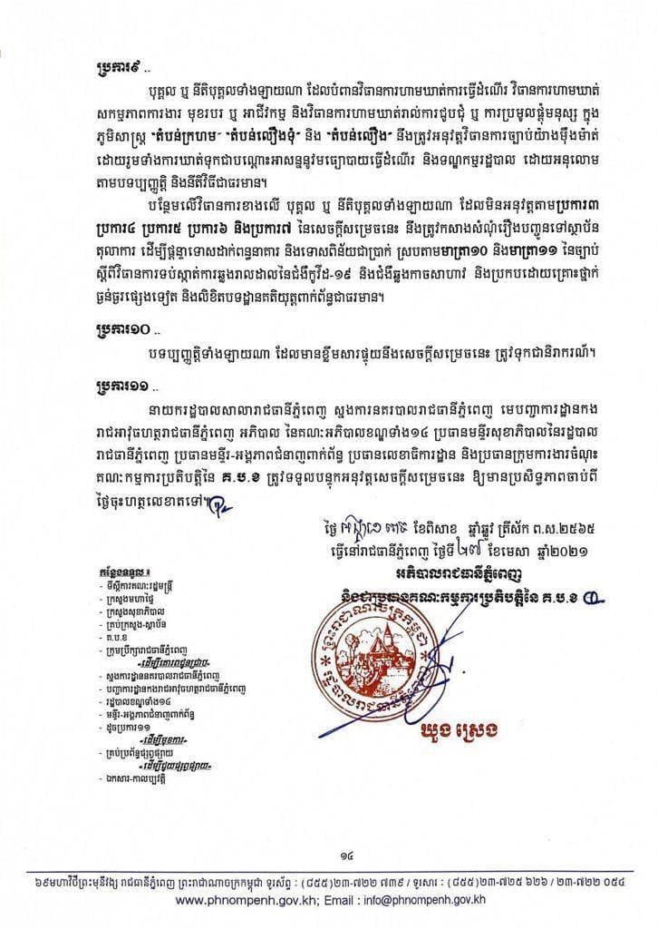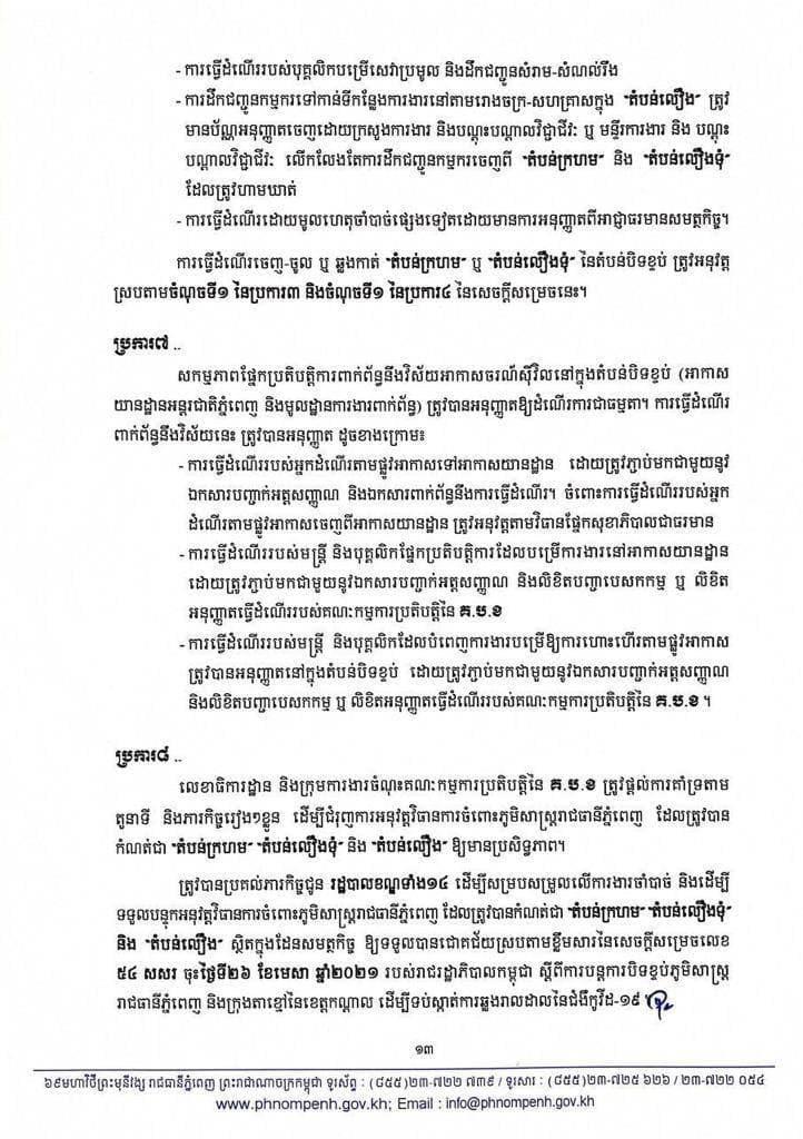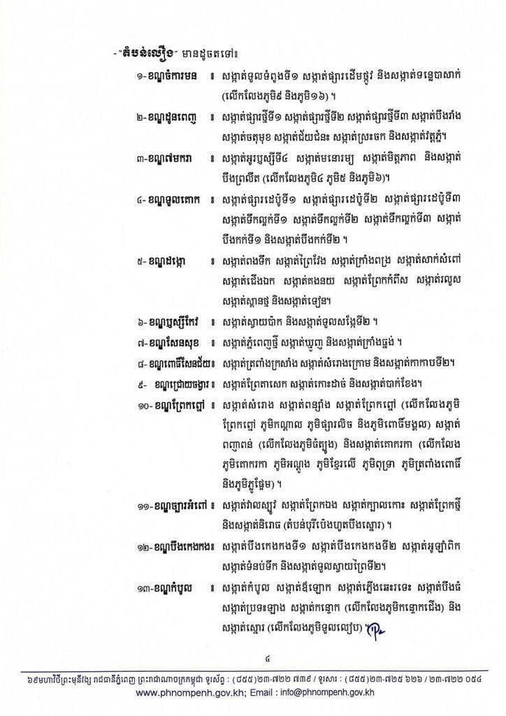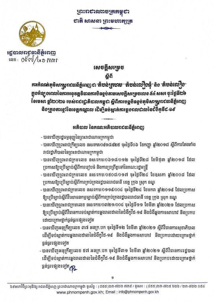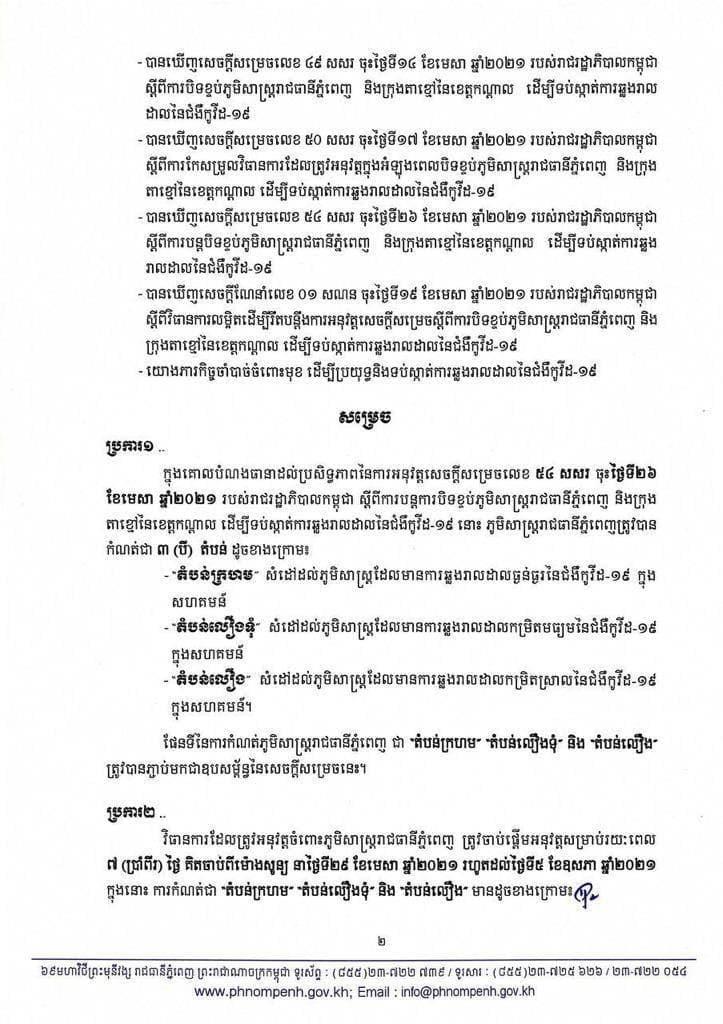 រដ្ឋបាលរាជធានីភ្នំពេញ នៅល្ងាចថ្ងៃអង្គារ ទី២៧ ខែមេសា ឆ្នាំ២០២១នេះ បានប្រកាសជាផ្លូវការហើយនូវការកំណត់ និងបែងចែកតំបន់ ដែលជា «តំបន់ក្រហម», «តំបន់លឿងទុំ» និង «តំបន់លឿង»។