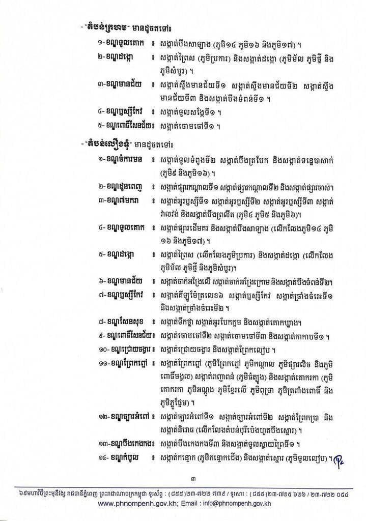 តំបន់ក្រហម រួមមាន៖ ១៖ ខណ្ឌទួលគោក៖ សង្កាត់បឹងសាឡាង (ភូមិ១៤ ភូមិ១៦ និងភូមិ១៧) ២៖ ខណ្ឌដង្កោ៖ សង្កាត់ព្រៃស (ភូមិប្រការ) និងសង្កាត់ដង្កោ (ភូមិម័ល ភូមិថ្មី និងភូមិសំបូរ) ៣៖ ខណ្ឌមានជ័យ៖ សង្កាត់ស្ទឹងមានជ័យទី១, សង្កាត់ស្ទឹងមានជ័យទី២, សង្កាត់ស្ទឹងមានជ័យទី៣ និងសង្កាត់បឹងទំពន់ទី១ ៤៖ ខណ្ឌឫស្សីកែវ៖ សង្កាត់ទួលសង្កែទី១ ៥៖ ខណ្ឌពោធិ៍សែនជ័យ៖ សង្កាត់ចោមចៅទី១។