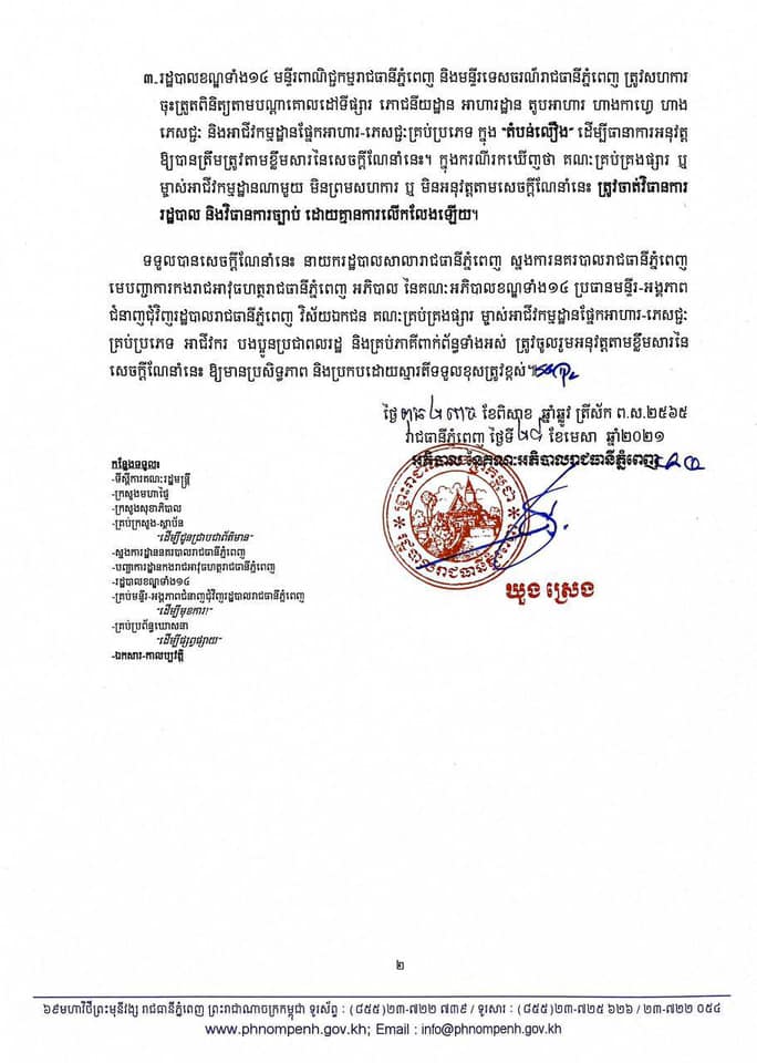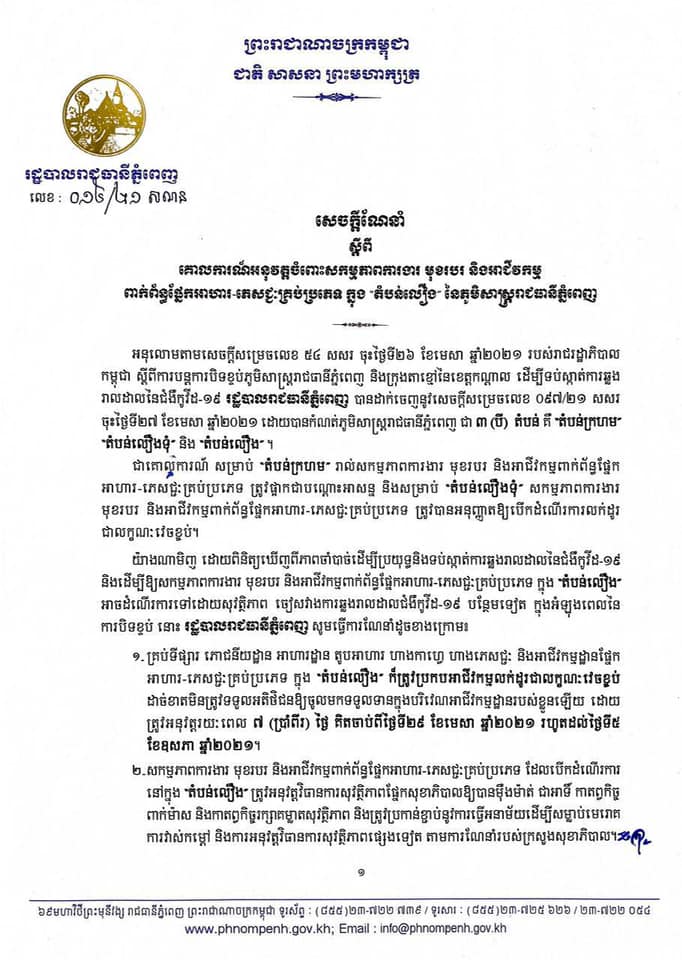 រដ្ឋបាលរាជធានីភ្នំពេញចេញគោលការណ៍ណែនាំពាក់ព័ន្ធសកម្មភាពមុខរបរ អាជីវកម្ម (អាហារ-ភេសជ្ជៈ) ក្នុងតំបន់លឿង