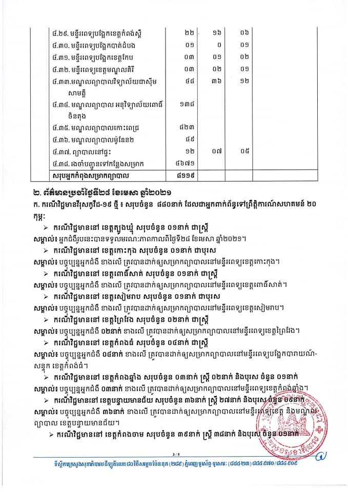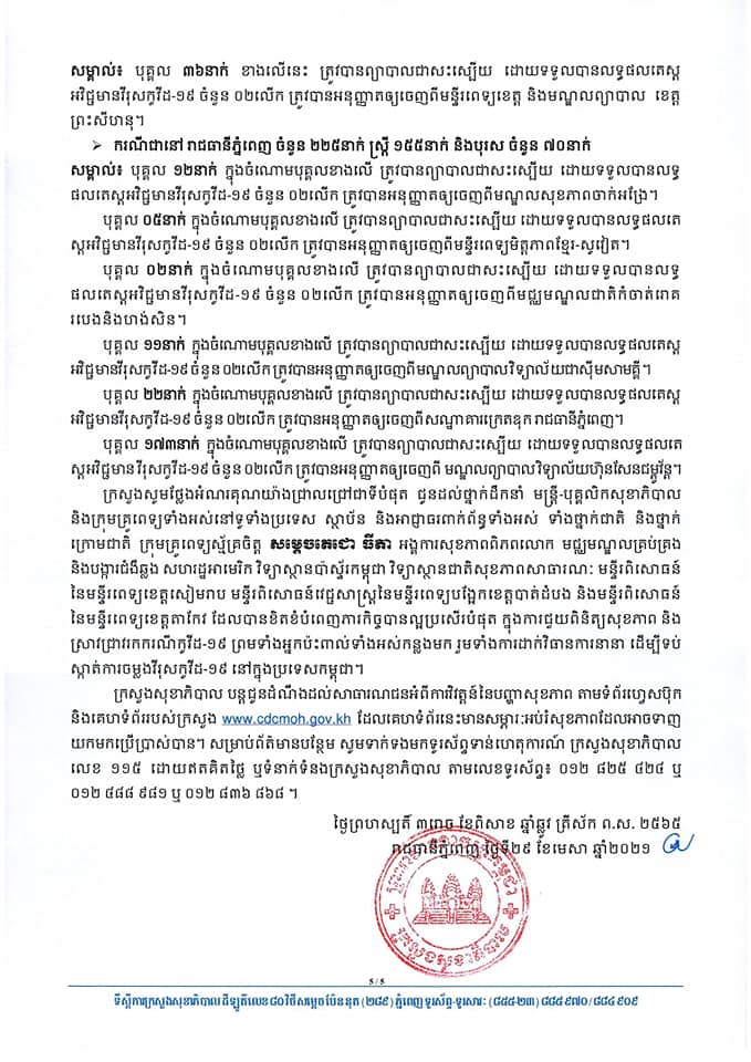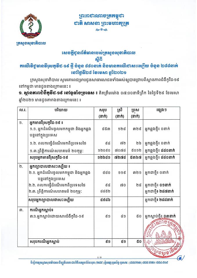 នៅថ្ងៃទី២៩ ខែមេសា ឆ្នាំ២០២១នេះ ក្រសួងសុខាភិបាលកម្ពុជា បានចេញសេចក្តីជូនដំណឹងពី ការរកឃើញករណីវិជ្ជមានវីរុសកូវីដ១៩ថ្មី ចំនួន ៨៨០នាក់ និងមានករណីជាសះស្បើយថ្មីចំនួន ២៨៨នាក់ផងដែរ។