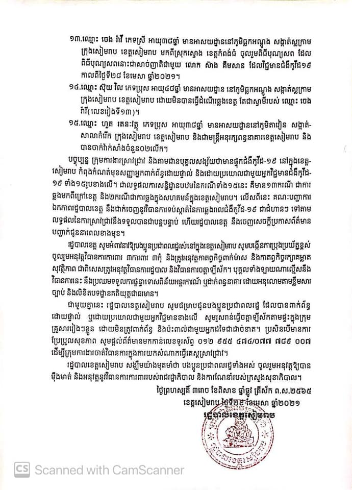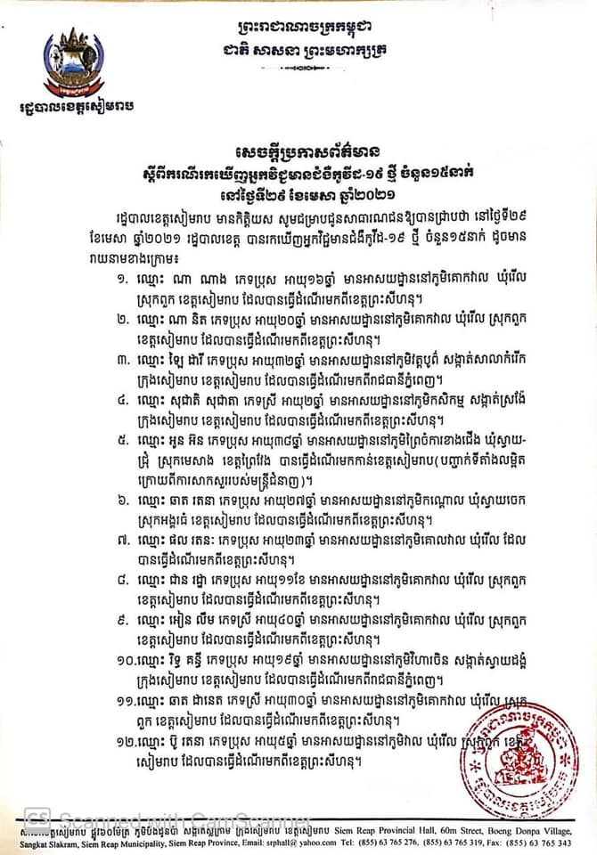 រដ្ឋបាលខេត្តសៀមរាប មានកិត្តិយស សូមជម្រាបជូនសាធារណជនឱ្យបានជ្រាបថា នៅថ្ងៃទី២៩ ខែមេសា ឆ្នាំ២០២១ រដ្ឋបាលខេត្ត បានរកឃើញអ្នកវិជ្ជមានជំងឺកូវីដ-១៩ ថ្មី ចំនួន១៥នាក់ ដូចមានរាយនាម ក្នុងលិខិតជូនដំណឹង។