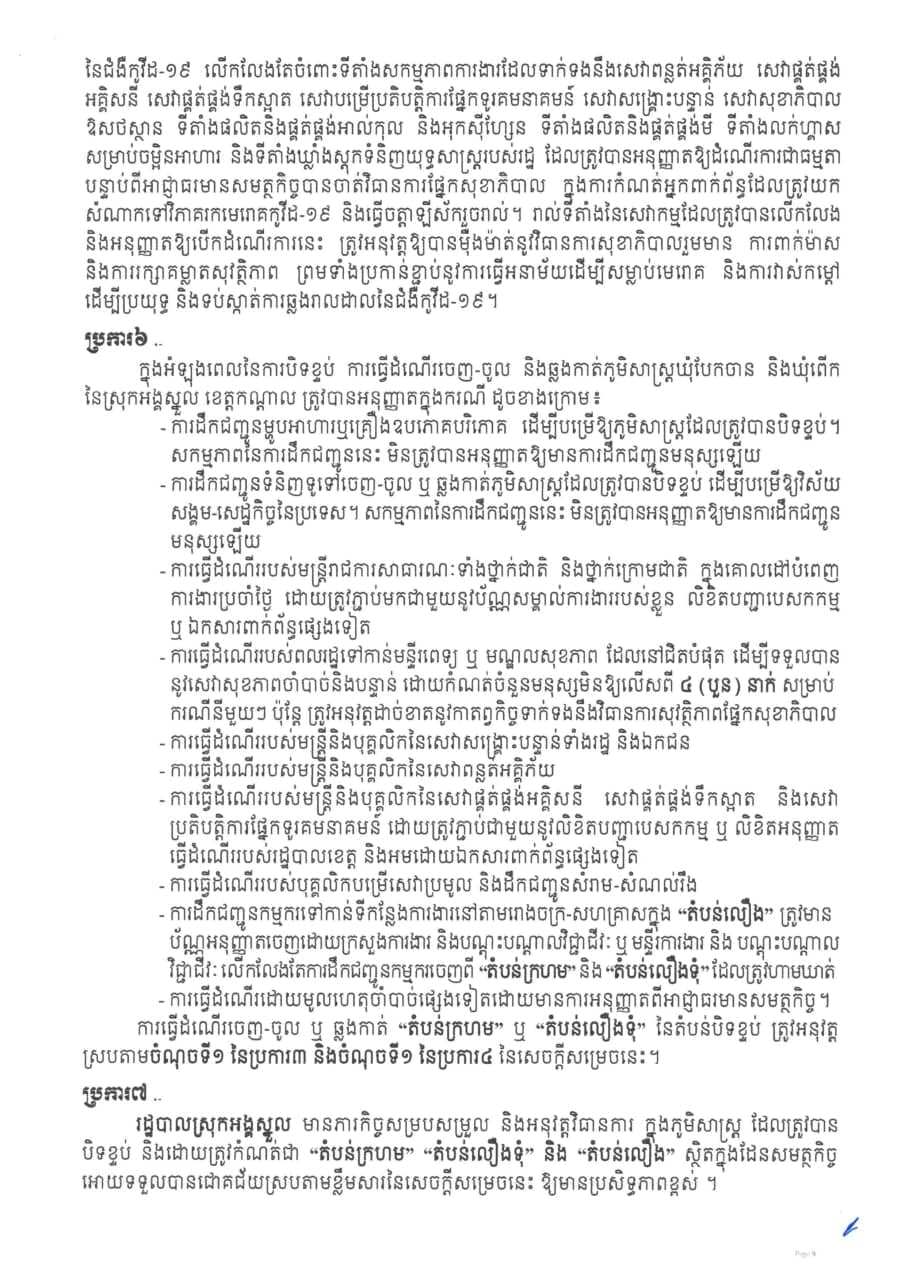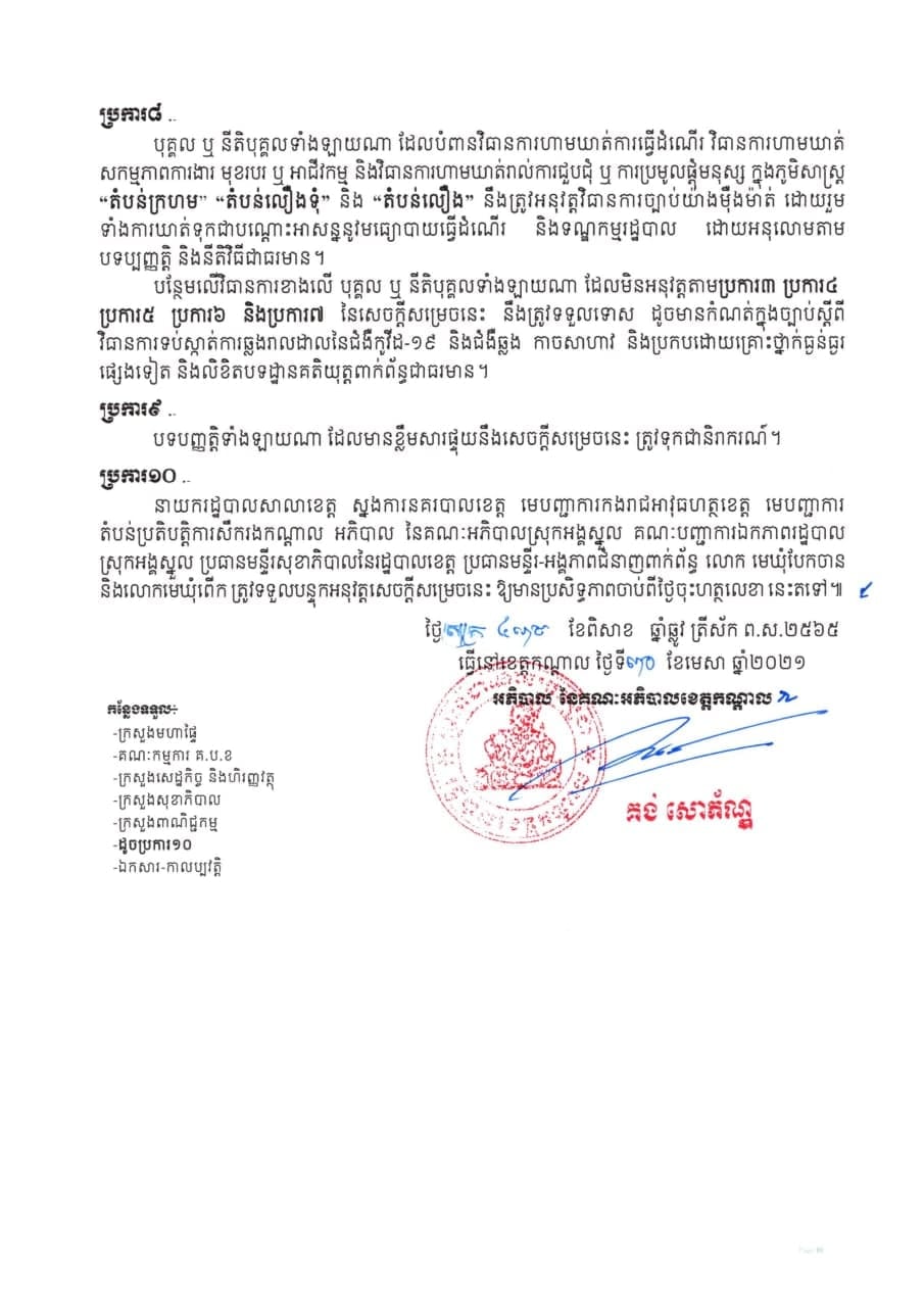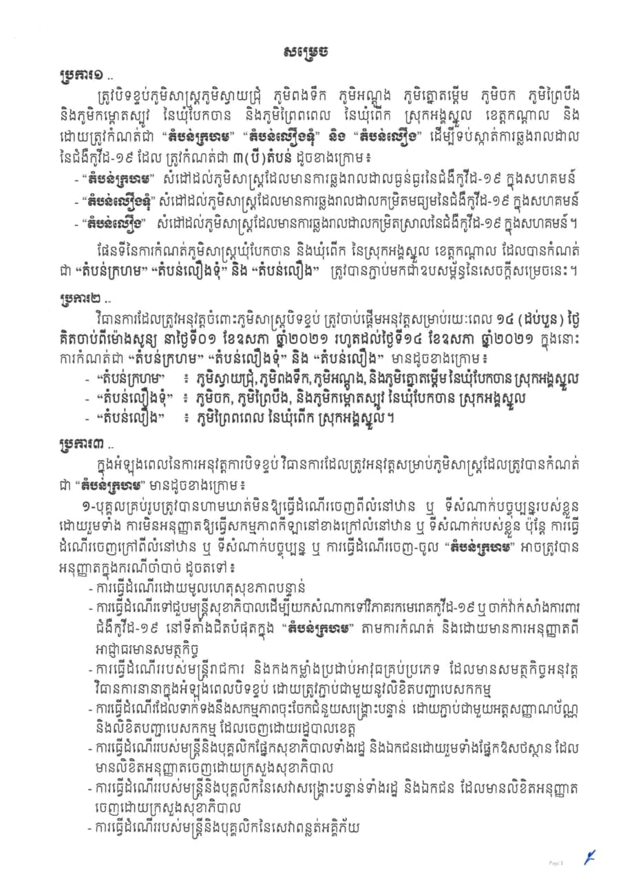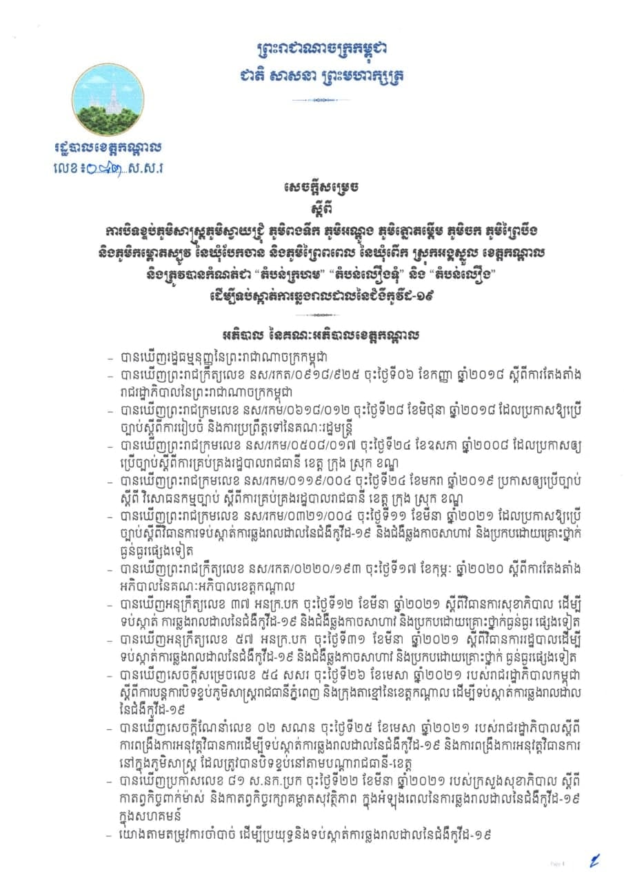 រដ្ឋបាលខេត្តកណ្ដាលចេញសេចក្ដីសម្រេចស្ដីពី ការបិទខ្ទប់ភូមិសាស្រ្តភូមិស្វាយជ្រុំ ភូមិពងទឹក ភូមិអណ្ដូង ភូមិត្នោតម្ពើម ភូមិចក ភូមិព្រៃបឹង និងភូមិកម្ពោតស្បូវ ឃុំបែកចាន និងភូមិព្រៃពពាល ឃុំពើក ស្រុកអង្គស្នួល ខេត្តកណ្ដាល និងត្រូវកំណត់ជា “តំបន់ក្រហម” “តំបន់លឿងទុំ” និង”តំបន់លឿង” ដើម្បីទប់ស្កាត់ការឆ្លងរាលដាលនៃជំងឺកូវីដ-១៩។