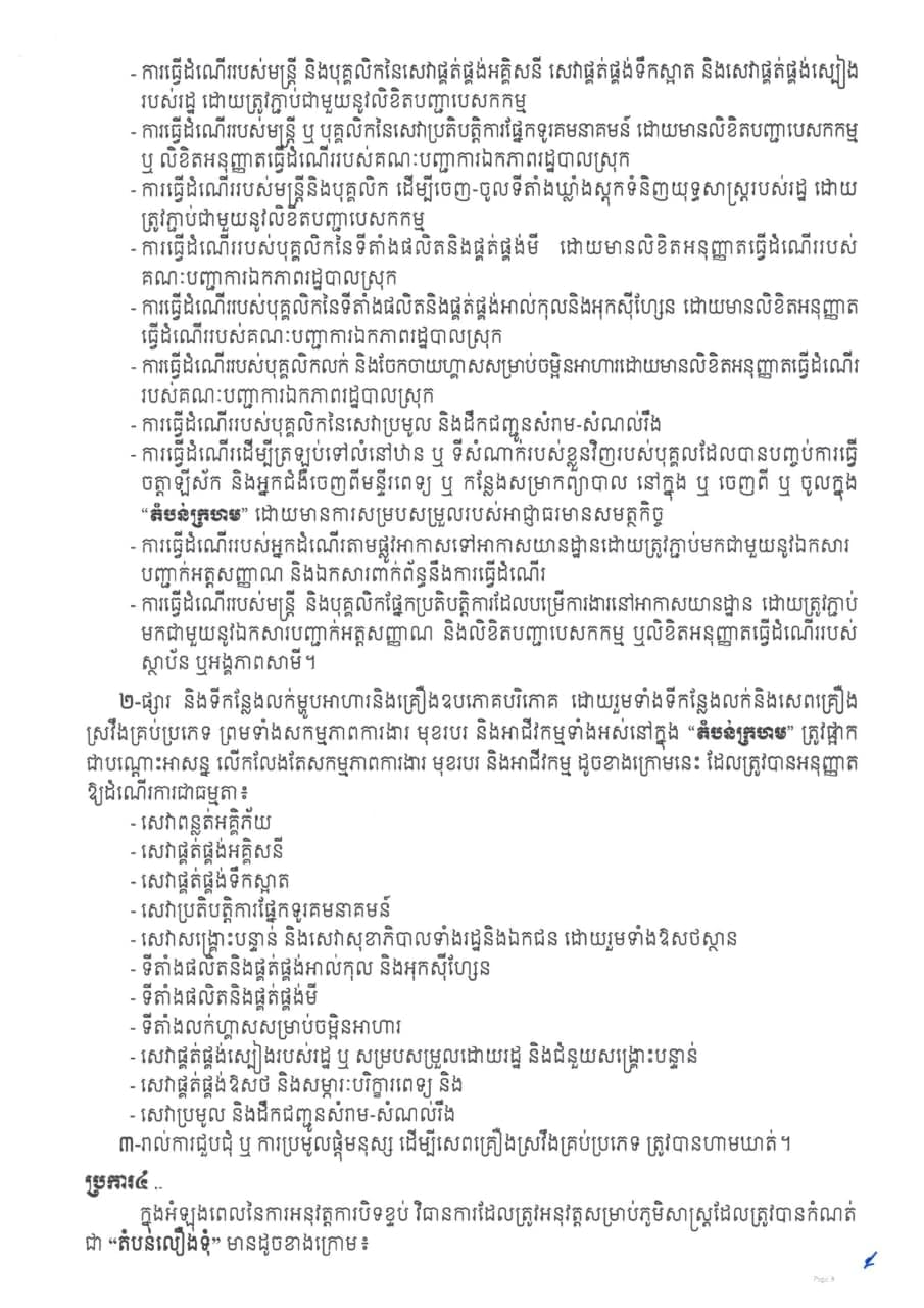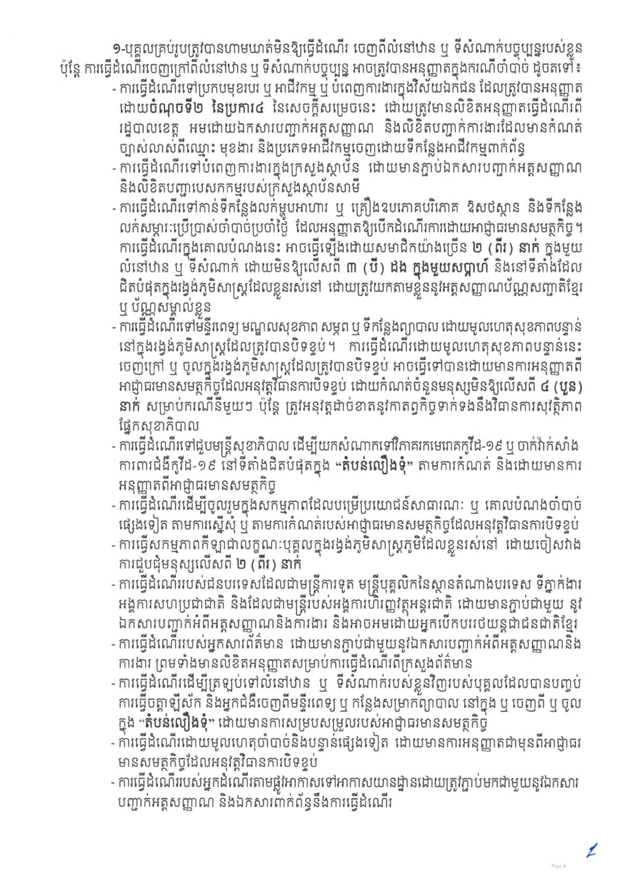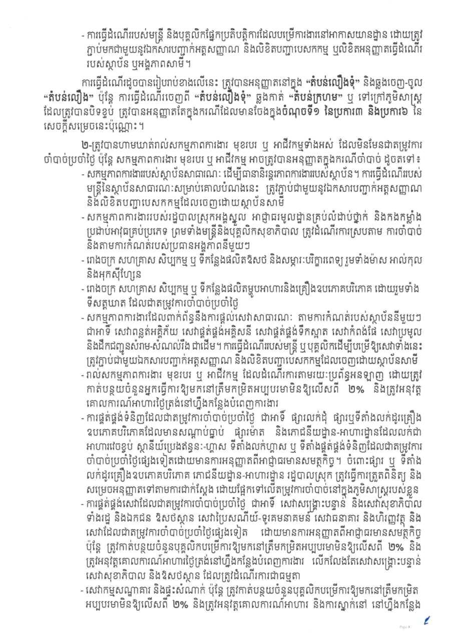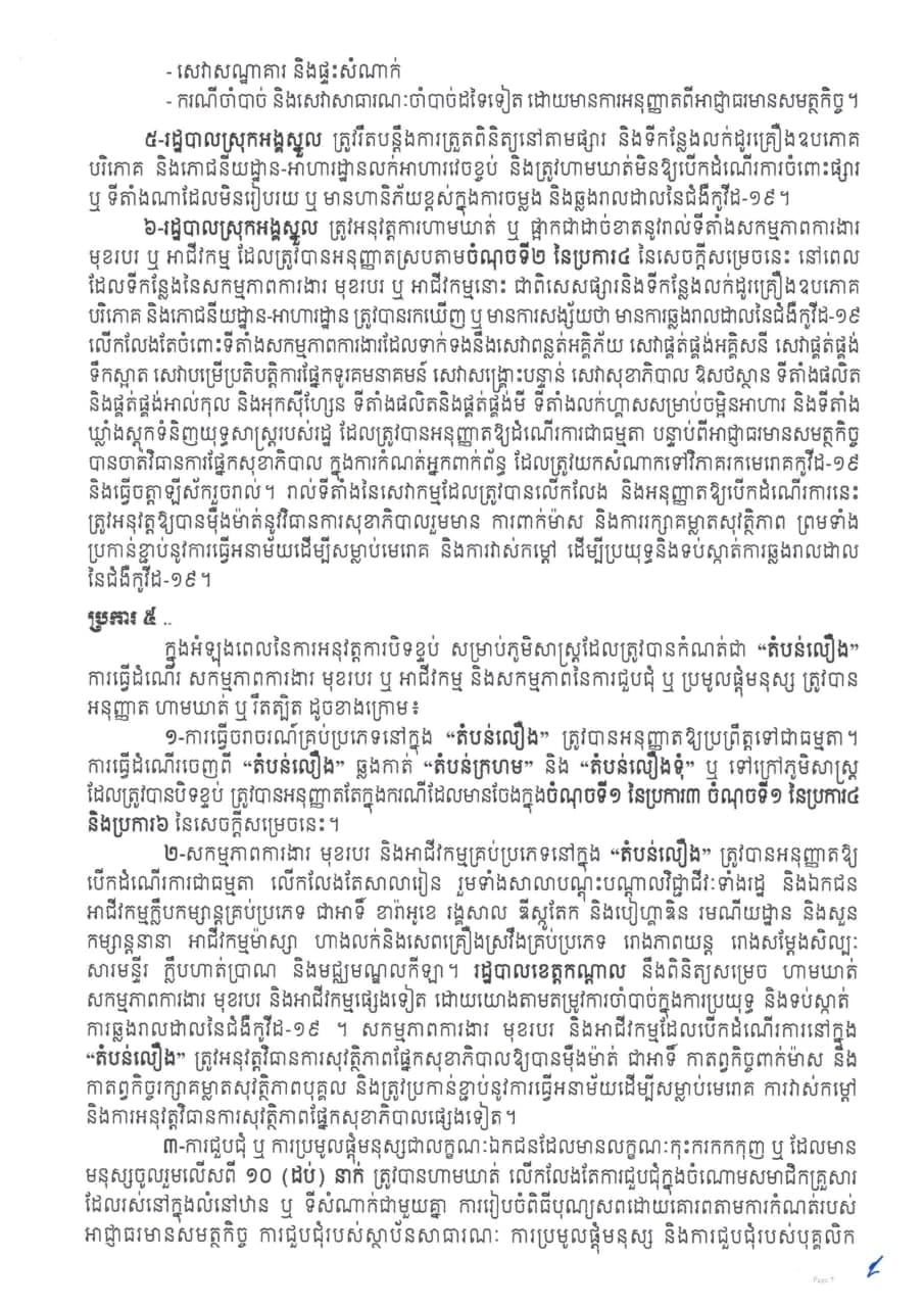 រដ្ឋបាលខេត្តកណ្ដាលចេញសេចក្ដីសម្រេចស្ដីពី ការបិទខ្ទប់ភូមិសាស្រ្តភូមិស្វាយជ្រុំ ភូមិពងទឹក ភូមិអណ្ដូង ភូមិត្នោតម្ពើម ភូមិចក ភូមិព្រៃបឹង និងភូមិកម្ពោតស្បូវ ឃុំបែកចាន និងភូមិព្រៃពពាល ឃុំពើក ស្រុកអង្គស្នួល ខេត្តកណ្ដាល និងត្រូវកំណត់ជា “តំបន់ក្រហម” “តំបន់លឿងទុំ” និង”តំបន់លឿង” ដើម្បីទប់ស្កាត់ការឆ្លងរាលដាលនៃជំងឺកូវីដ-១៩។