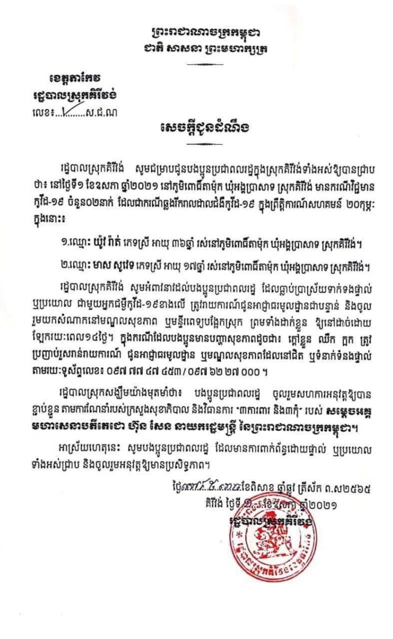 រដ្ឋបាលស្រុកគិរីវង់ សូមអំពាវនាវដល់បងប្អូនប្រជាពលរដ្ឋដែលធ្លាប់ប្រាស្រ័យទាក់ទងជាមួយអ្នកជំងឺកូវីដ-១៩ ខាងលើ ត្រូវរាយការណ៍ជូនអាជ្ញាធរមូលដ្ឋានជាបន្ទាន់ និងរួសរាន់ទៅយកសំណាក។