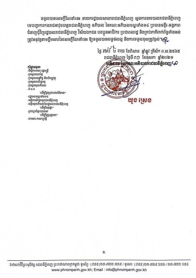 យោងតាមសេចក្តីណែនាំរបស់រដ្ឋបាលរាជធានីភ្នំពេញ ស្តីពីការអនុញ្ញាតគោលការណ៍ពិសេសចំពោះសេវាកម្មផ្គត់ផ្គង់ទំនិញ ដែលជា​ តម្រូវការចាំបាច់ប្រចាំថ្ងៃ ក្នុង “តំបន់លឿងទុំ” និង “តំបន់លឿង” នៃភូមិសាស្ត្ររាជធានីភ្នំពេញ បានឱ្យដឹងថា កន្លងមករដ្ឋបាលរាជធានី ភ្នំពេញ បានដាក់ចេញនូវសេចក្តីណែនាំលេខ ០១៣/២១ សណន ចុះថ្ងៃទី២៣ខែមេសា ឆ្នាំ២០២១ ស្តីពីការផ្អាកដំណើរការជាបណ្តោះ អាសន្នផ្សាររដ្ឋ និងផ្សារមិនរៀបរយទាំងអស់ ក្នុងរាជធានីភ្នំពេញ ក្នុងគោលបំណងថែរក្សាអាយុជីវិត និងការពារសុខភាពរបស់បងប្អូន អាជីវករ ក៏ដូចជាដើម្បីឈានទៅកាត់ផ្តាច់ប្រភពចម្លង និងទប់ស្កាត់ការរីករាលដាលជំងឺកូវីដ-១៩ ក្នុងព្រឹត្តិការណ៍សហគមន៍ ២០ កុម្ភៈ ២០២១”។ សេចក្តីណែនាំបានឱ្យដឹងទៀតថា ដោយអនុលោមតាមសេចក្តីសម្រេចលេខ ០៩៧/២១ សសរ ចុះថ្ងៃទី២៧ ខែមេសា ឆ្នាំ២០២១របស់រដ្ឋបាលរាជធានីភ្នំពេញ ជាគោលការណ៍សម្រាប់ “តំបន់ក្រហម” ផ្សារនិងទីកន្លែងលក់ម្ហូបអាហារនិងគ្រឿងឧបភោគ បរិភោគ ត្រូវផ្អាកជាបណ្តោះអាសន្ន។