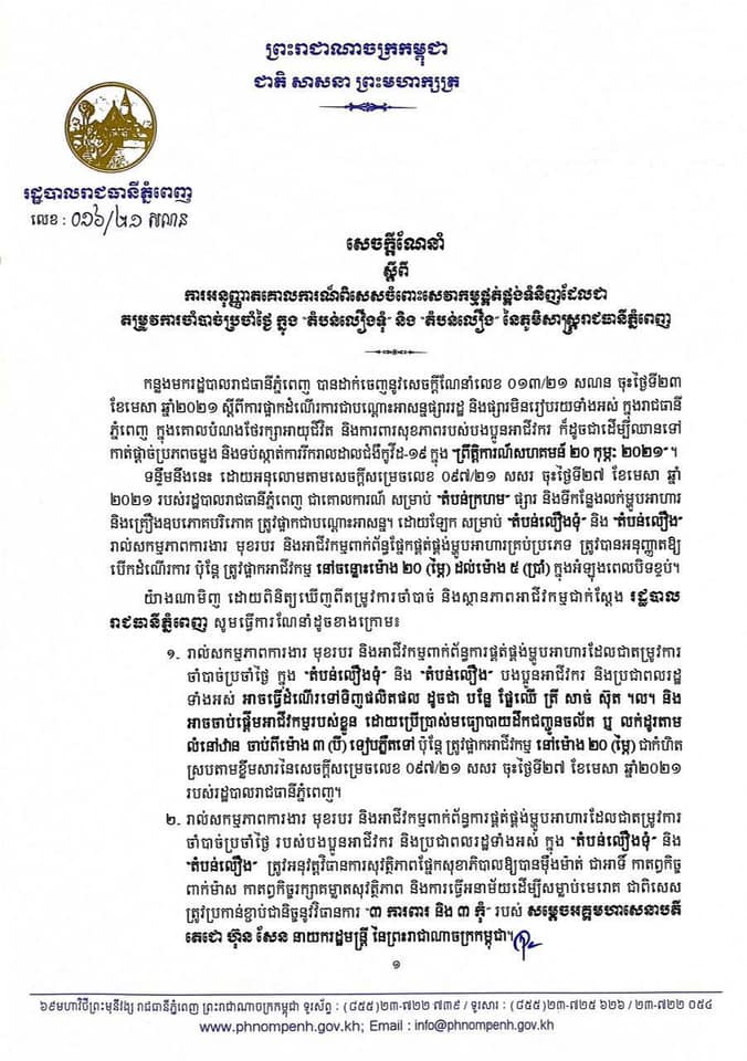 ១. រាល់សកម្មភាពការងារ មុខរបរ និងអាជីវកម្មពាក់ព័ន្ធការផ្គត់ផ្គង់ម្ហូបអាហារដែលជាតម្រូវការចាំបាច់ប្រចាំថ្ងៃ ក្នុង តំបន់លឿងទុំ” និង “តំបន់លឿង” បងប្អូនអាជីវករ និងប្រជាពលរដ្ឋទាំងអស់ អាចធ្វើដំណើរទៅទិញផលិតផល ដូចជា បន្លែ ផ្លែឈើ ត្រី សាច់ ស៊ុត ។ល។ និងអាចចាប់ផ្តើមអាជីវកម្មរបស់ខ្លួន ដោយប្រើប្រាស់មធ្យោបាយដឹកជញ្ជូនចល័ត ឬ លក់ដូរតាមលំនៅឋាន ចាប់ពីម៉ោង ៣ (បី) ទៀបភ្លឺតទៅ ប៉ុន្តែ ត្រូវផ្អាកអាជីវកម្ម នៅម៉ោង ២០ (ម្ភៃ) ជាកំហិតស្របតាមខ្លឹមសារនៃសេចក្តីសម្រេចលេខ ០៩៧/២១ សសរ ចុះថ្ងៃទី២៧ ខែមេសា ឆ្នាំ២០២១របស់រដ្ឋបាលរាជធានីភ្នំពេញ។