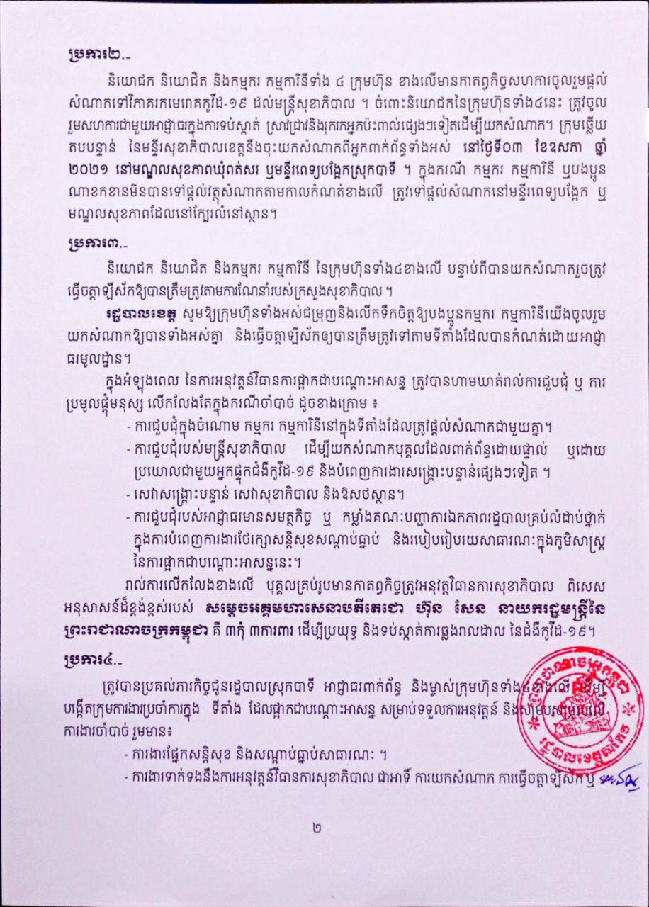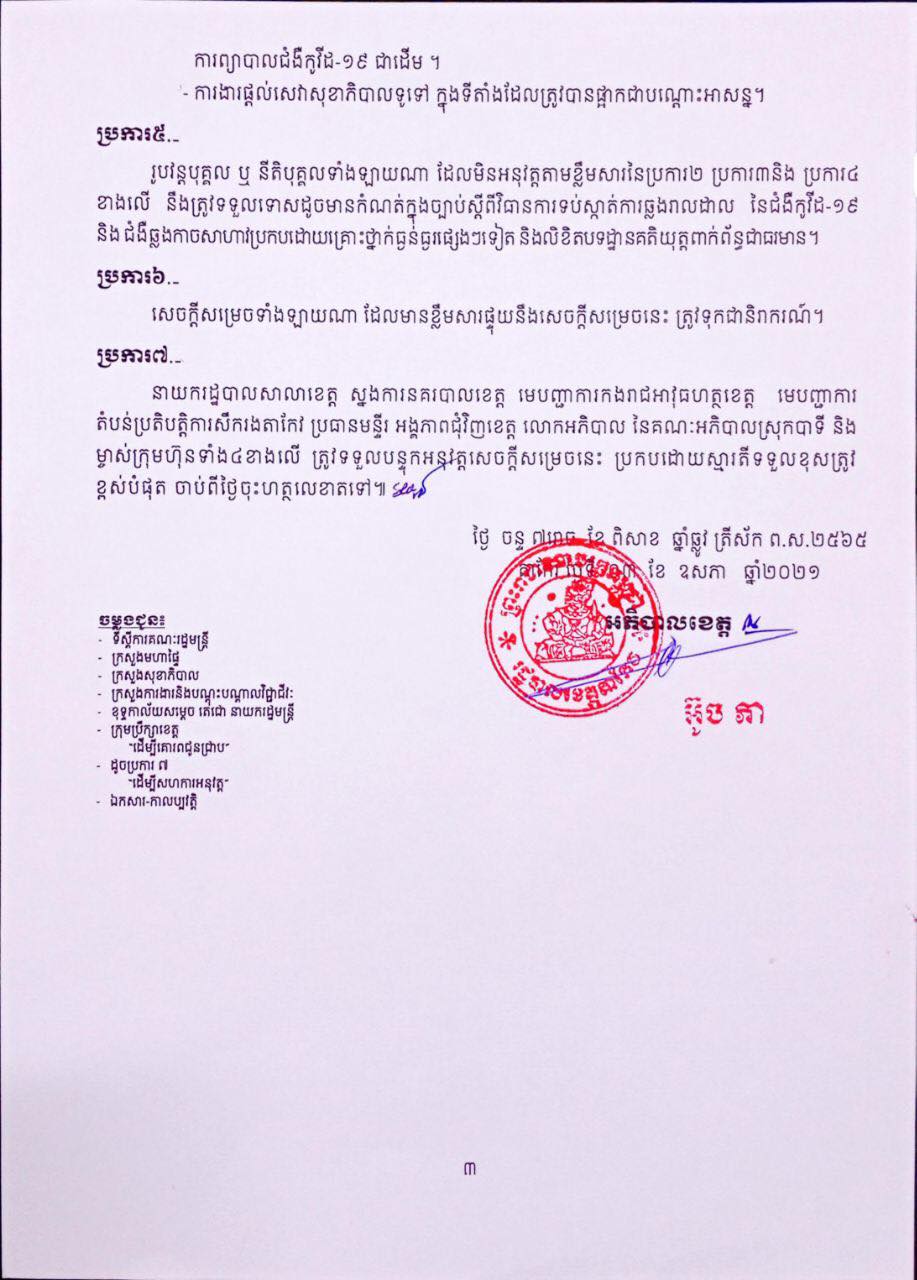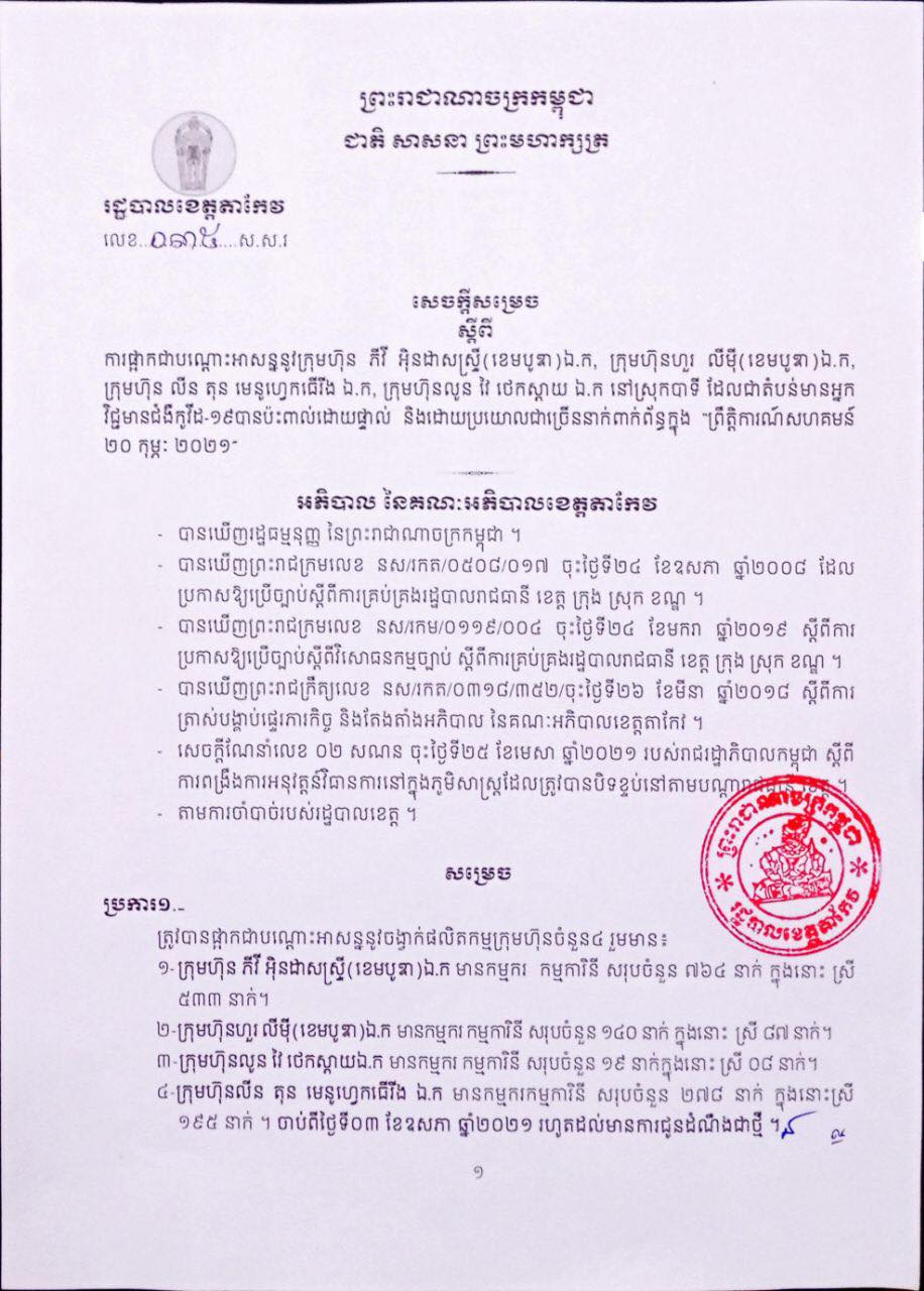 (តាកែវ)៖ រដ្ឋបាលខេត្តតាកែវ នៅព្រឹកថ្ងៃទី០៣ ខែឧសភា ឆ្នាំ២០២១នេះ បានចេញសេចក្តីសម្រេចផ្អាកដំណើរការ ជាបណ្តោះអាសន្នរោងចក្រចំនួន ៤ នៅក្នុងស្រុកបាទី និងតម្រូវឲ្យកម្មករនិយោជិតជាង១២០០នាក់ ធ្វើតេស្តរកវីរុសកូវីដ១៩ និងធ្វើចត្តាឡីស័ក ឲ្យបានត្រឹមត្រូវ។ សូមប្រិយមិត្តអាន សេចក្តីសម្រេចស្តីពីការផ្អាកជាបណ្តោះអាសន្ននូវរោងចក្រ សហគ្រាសមួយចំនួនដែលពាក់ព័ន្ធជំងឺកូវីដ-១៩ ខាងក្រោម៖