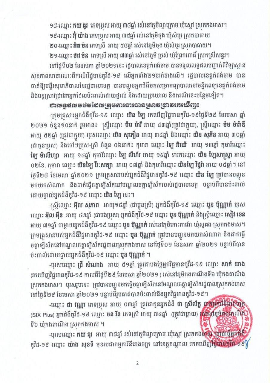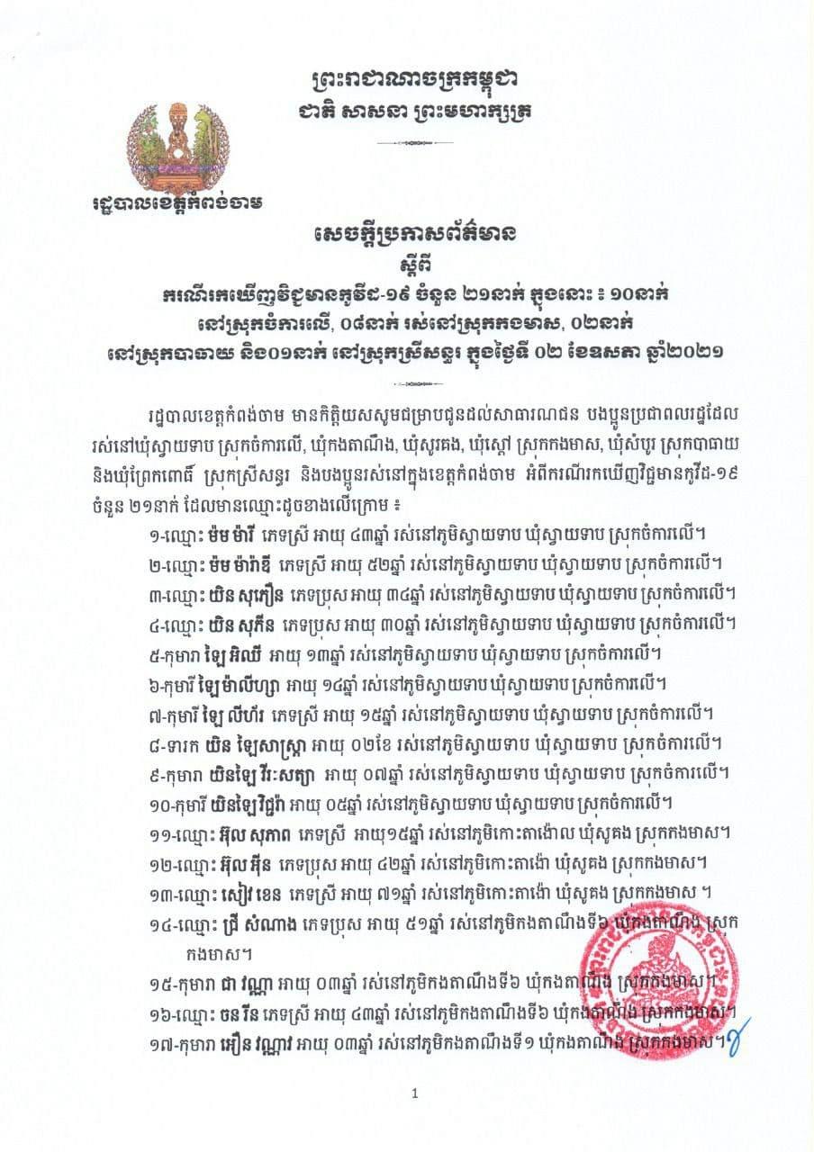 ខេត្តកំពង់ចាម៖ យោងតាមសារលិខិតរបស់ រដ្ឋបាលខេត្តកំពង់ចាម បានចេញសេចក្តីប្រកាសព័ត៌មានរបស់រដ្ឋបាលខេត្តស្តីពីករណីរកឃើញវិជ្ជមានកូវីដ-១៩ ចំនួន ២១នាក់ ក្នុងនោះមាន៖ ១០នាក់ នៅស្រុកចំការលើ, ០៨នាក់ រស់នៅស្រុកកងមាស, ០២នាក់នៅស្រុកបាធាយ និង០១នាក់ នៅស្រុកស្រីសន្ធរ ក្នុងថ្ងៃទី០២ ខែឧសភា ឆ្នាំ២០២១។