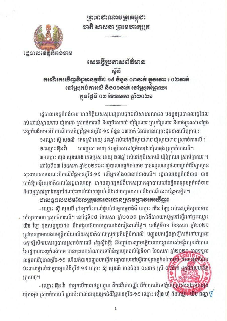 ខេត្តកំពង់ចាម៖ យោងតាមសារលិខិតរបស់ រដ្ឋបាលខេត្តកំពង់ចាម បានចេញសេចក្តីប្រកាសព័ត៌មានរបស់រដ្ឋបាលខេត្តកំពង់ចាម ស្តីពីករណីរកឃើញវិជ្ជមានកូវីដ-១៩ចំនួន ០៣នាក់ ក្នុងនោះ ០២នាក់ នៅស្រុកចំការលើ និង០១ នៅស្រុកព្រៃឈរ ក្នុងថ្ងៃទី០៣ ខែឧសភា ឆ្នាំ២០២១ ដោយរដ្ឋបាលខេត្ត សូមជម្រាបជូនដល់សាធារណជន បងប្អូនប្រជាពលរដ្ឋដែលស់នៅឃុំស្វាយទាប ឃុំតាអុង ស្រុកចំការលើ និងភូមិសេកយំ ឃុំព្រៃឈរ និងបងប្អូនរស់នៅក្នុងខេត្តកំពង់ចាម អំពីករណីរកឃើញវិជ្ជមានកូវីដ-១៩ ចំនួន ០៣នាក់ ដែលមានឈ្មោះដូចខាងក្រោម៖