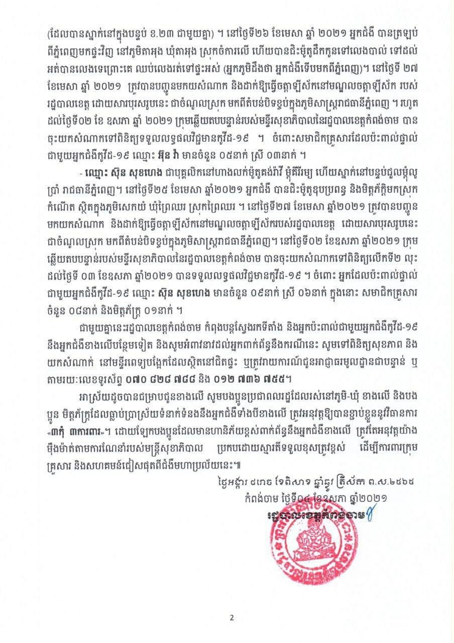 នៅថ្ងៃទី០៣ ខែឧសភា ឆ្នាំ២០២១នេះ រដ្ឋបាលខេត្តកំពង់ចាម បានទទួលលទ្ធផលបញ្ជាក់ពីវិទ្យាស្ថានសុខភាពសាធារណៈពីករណីវិជ្ជមានកូវីដ-១៩ លើអ្នកទាំង០៣នាក់ខាងលើ។ រដ្ឋបាលខេត្ត បានចាត់ឲ្យមន្ទីរសុខាភិបាលនៃរដ្ឋបាលខេត្ត បញ្ជូនអ្នកជំងឺមកសម្រាកព្យាបាលនៅមន្ទីរពេទ្យខេត្តកំពង់ចាម និងបន្តស្រាវជ្រាវរកអ្នកដែលប៉ះពាល់ដោយផ្ទាល់ និងដោយប្រយោល នឹងករណីនេះបន្ថែមទៀត។