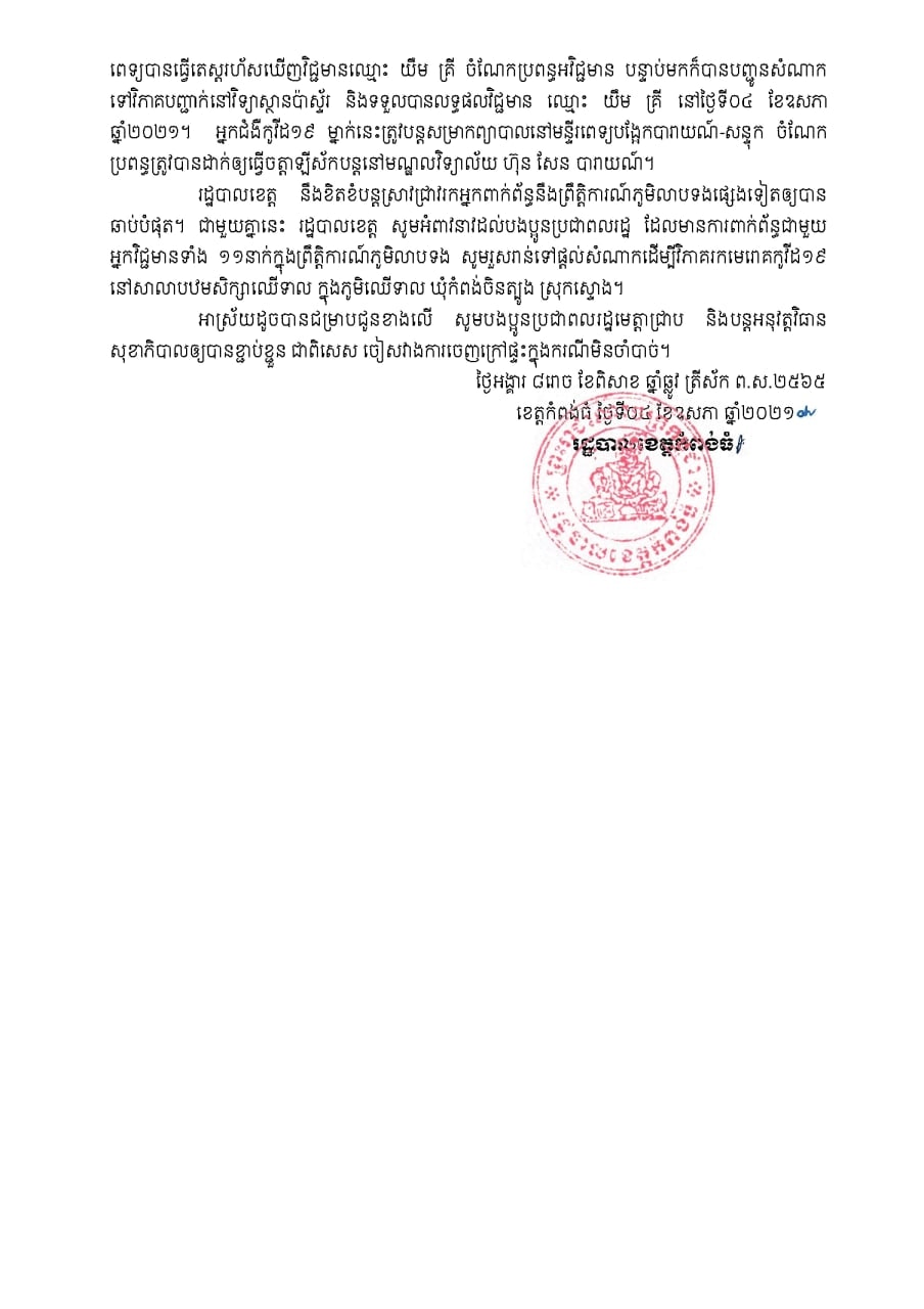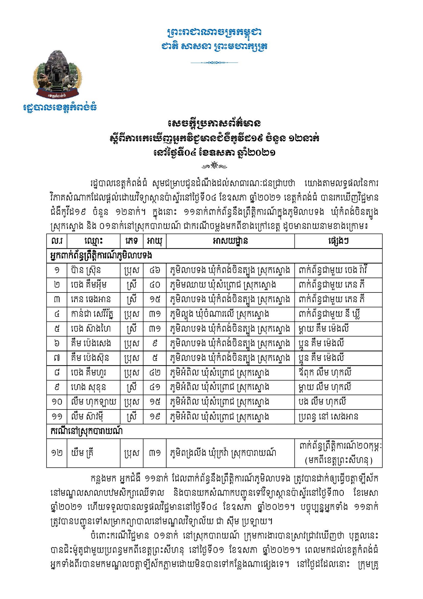 យោងតាមការបញ្ជាក់ពីរដ្ឋបាលខេត្តកំពង់ធំ បានឲ្យដឹងថា យោងតាមលទ្ធផលនៃការវិភាគសំណាកដែលផ្តល់ដោយវិទ្យាស្ថានប៉ាស្ទ័រនៅថ្ងៃទី០៤ ខែឧសភា ឆ្នាំ២០២១ ខេត្តកំពង់ធំ បានរកឃើញវិជ្ជមានជំងឺកូវីដ១៩ ចំនួន១២នាក់។