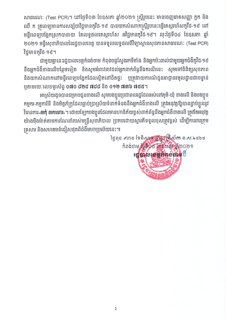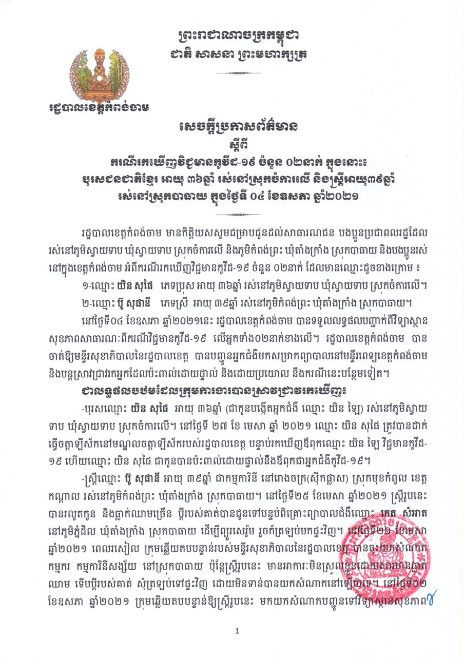 នៅថ្ងៃទី០៤ ខែឧសភា ឆ្នាំ២០២១នេះ រដ្ឋបាលខេត្តកំពង់ចាម បានទទួលលទ្ធផលបញ្ជាក់ពីវិទ្យាស្ថានសុខភាពសាធារណៈពីករណីវិជ្ជមានកូវីដ-១៩ លើអ្នកទាំង០២ខាងលើ។ ជាមួយគ្នានេះ រដ្ឋបាលខេត្ត កំពុងបន្តស្វែងរកទីតាំង និងអ្នកប៉ះពាល់ជាមួយអ្នកជំងឺខាងលើ និងអំពាវនាវដល់អ្នកពាក់ព័ន្ធនឹងករណីនេះ សូមពិនិត្យសុខភាព និងយកសំណាកនៅមន្ទីរពេទ្យបង្អែក ដែលនៅជិតផ្ទះ ឬត្រូវរាយការណ៍ជូនអាជ្ញាធរមូលដ្ឋានជាបន្ទាន់។