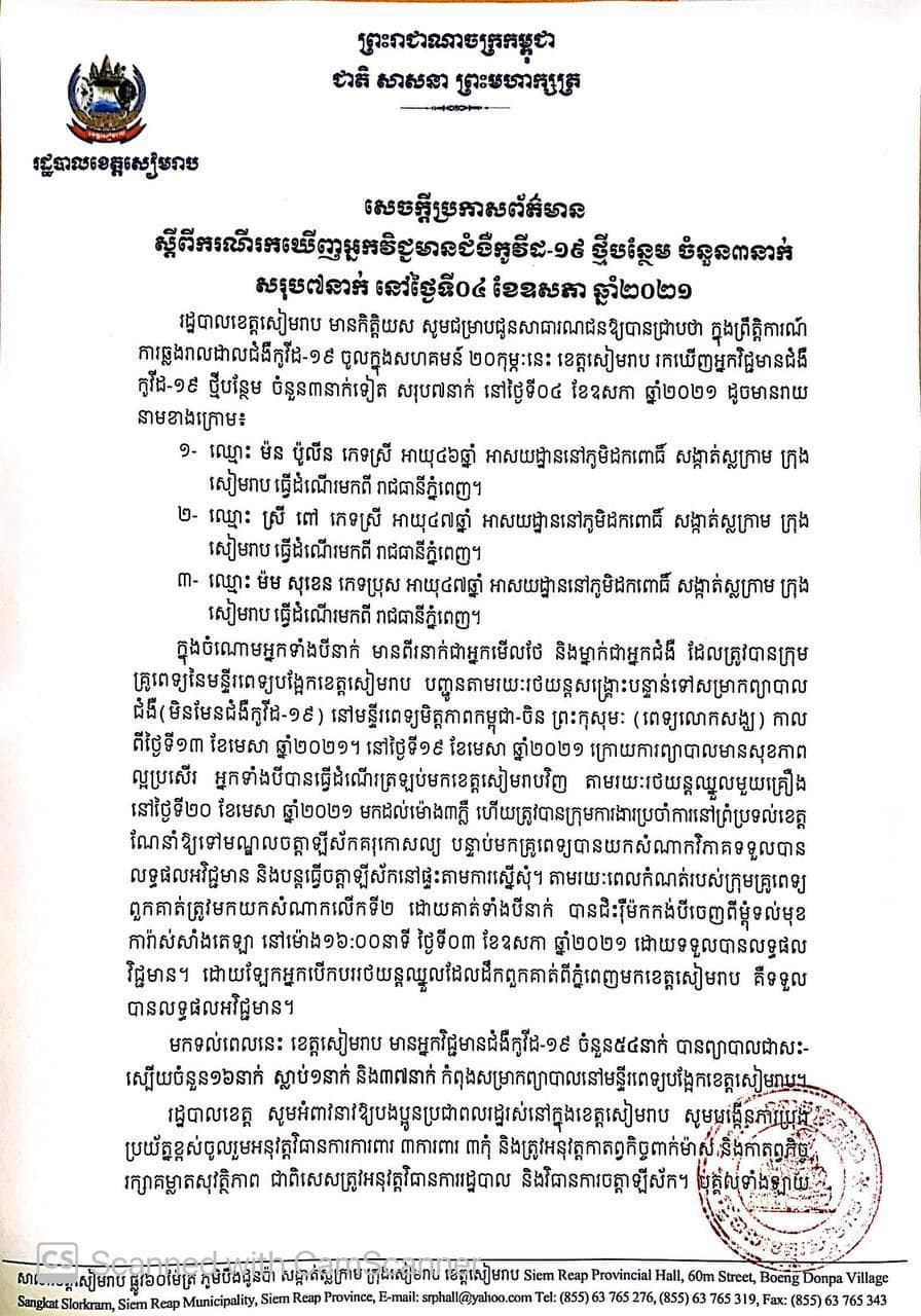 រដ្ឋបាលខេត្តសៀមរាប មានកិត្តិយស សូមជម្រាបជូនសាធារណជនឱ្យបានជ្រាបថា ក្នុងព្រឹត្តិការណ៍ការឆ្លងរាលដាលជំងឺកូវីដ-១៩ ចូលក្នុងសហគមន៍ ២០កុម្ភៈនេះ ខេត្តសៀមរាប រកឃើញអ្នកវិជ្ជមានជំងឺកូវីដ-១៩ ថ្មីបន្ថែម ចំនួន៣នាក់ទៀត សរុប៧នាក់ នៅថ្ងៃទី០៤ ខែឧសភា ឆ្នាំ២០២១ ដូចមានរាយនាមខាងក្រោម៖