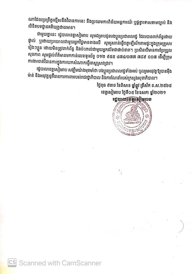 រដ្ឋបាលខេត្ត សូមអំពាវនាវឱ្យបងប្អូនប្រជាពលរដ្ឋរស់នៅក្នុងខេត្តសៀមរាប សូមបង្កើនការប្រុងប្រយ័ត្នខ្ពស់ចូលរួមអនុវត្តវិធានការការពារ ៣ការពារ ៣កុំ និងត្រូវអនុវត្តកាតព្វកិច្ចពាក់ម៉ាស និងកាតព្វកិច្ចរក្សាគម្លាតសុវត្ថិភាព ជាពិសេសត្រូវអនុវត្តវិធានការរដ្ឋបាល និងវិធានការចត្តាឡីស័ក។ បុគ្គលទាំងឡាយណាដែលប្រព្រឹត្តល្មើសនឹងវិធានការនេះ នឹងប្រឈមការពិន័យអន្តការណ៍ ឬផ្តន្ទាទោសតាមច្បាប់ និងលិខិតបទដ្ឋានគតិយុត្តជាធរមាន។