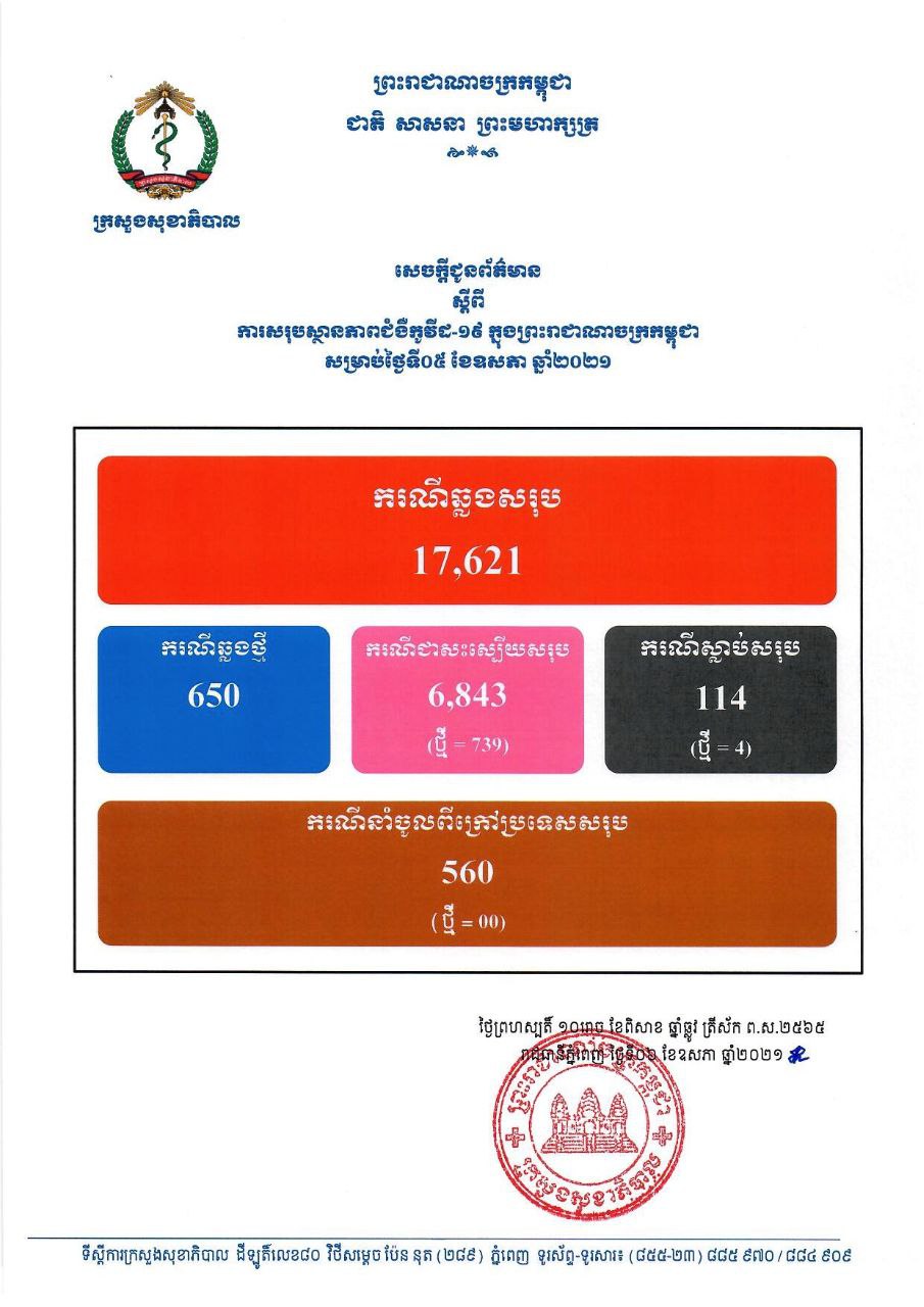 នៅថ្ងៃទី៦ ខែឧសភា ឆ្នាំ២០២១នេះ ក្រសួងសុខាភិបាលកម្ពុជា បានចេញសេចក្តីជូនដំណឹងពី ការរកឃើញករណីវិជ្ជមានវីរុសកូវីដ១៩ថ្មី ចំនួន ៦៥០នាក់ ខណៈអ្នកបានជាសះស្បើយថ្មីមានចំនួន ៧៣៩នាក់ និងបាត់បង់ជីវិត៤នាក់៕