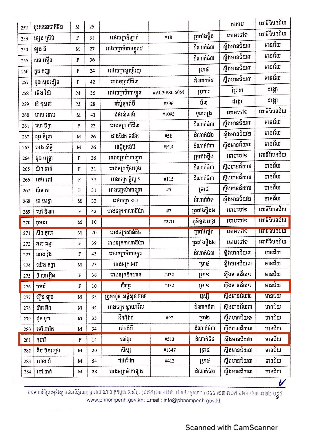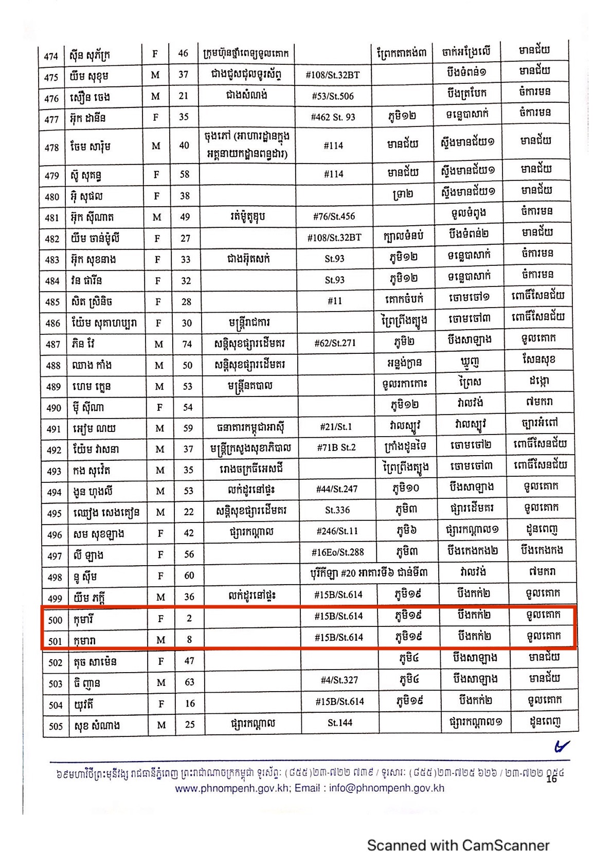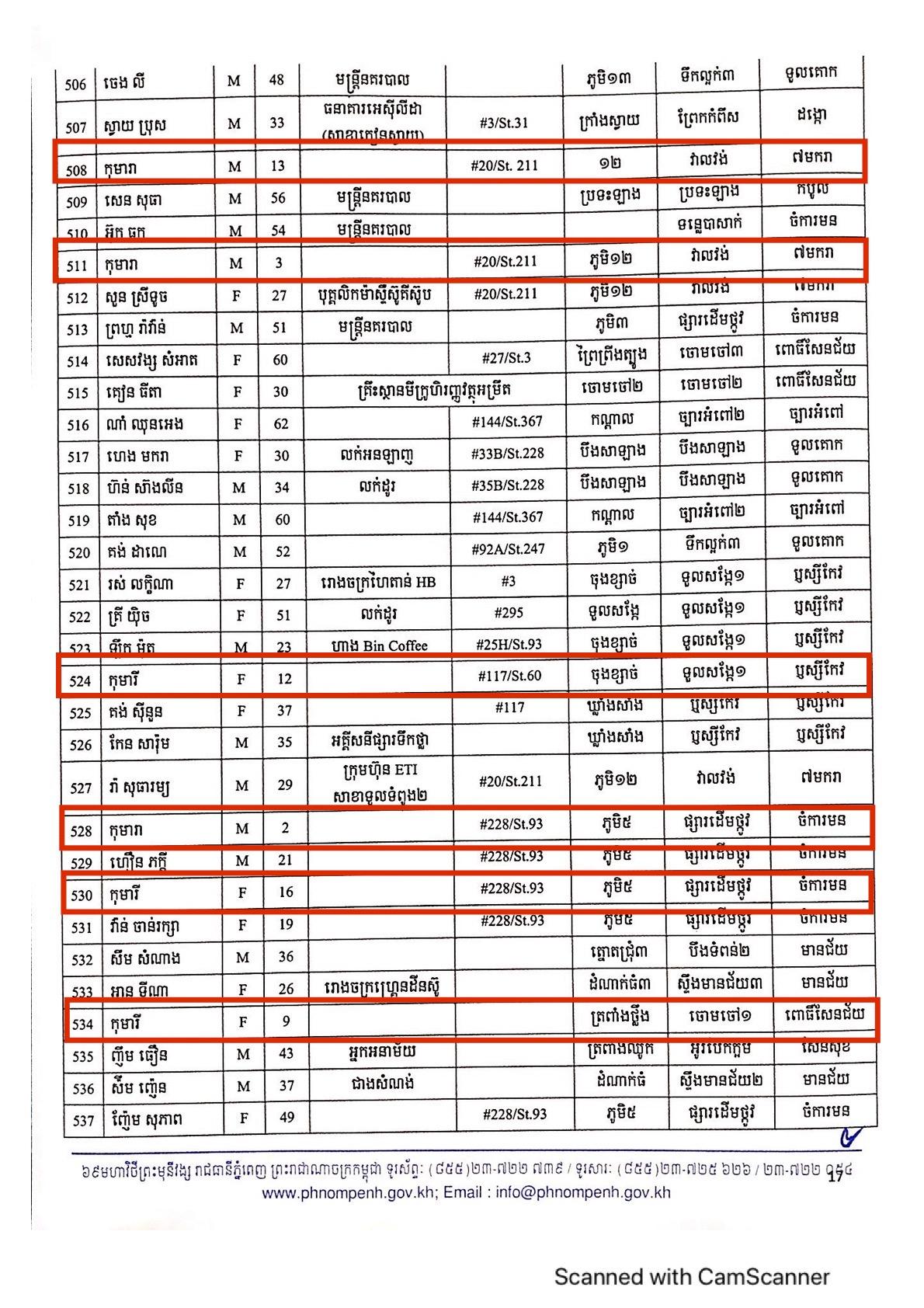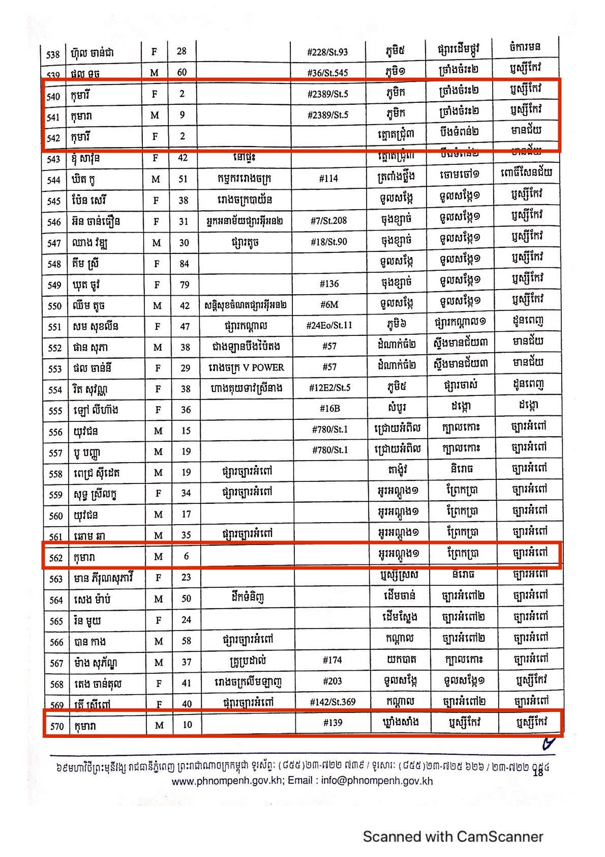 នាល្ងាចថ្ងៃទី៦ ខែឧសភា ឆ្នាំ២០២១ រដ្ឋបាលរាជធានីភ្នំពេញ បានធ្វើការបង្ហាញអត្តសញ្ញាញរបស់អ្នកជំងឺកូវីដ១៩ នៅក្នុងរាជធានីភ្នំពេញ ចំនួន ៥៧៨នាក់ ហើយនៅក្នុងនោះផងដែរ ក៏មានកុមារតូចៗដែលបានឆ្លងកូវីដ១៩ រហូតដល់ទៅ៣៣នាក់ ដែលមានដូចខាងក្រោម៖