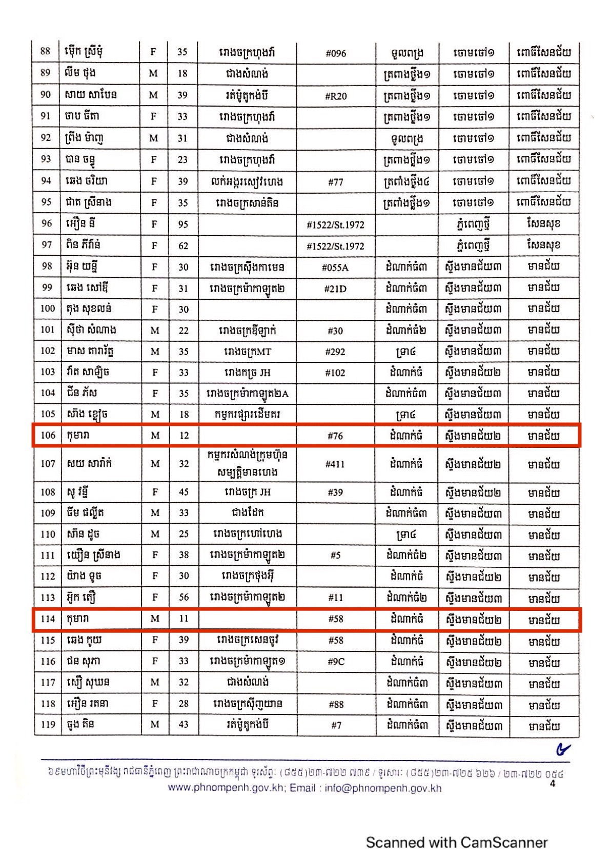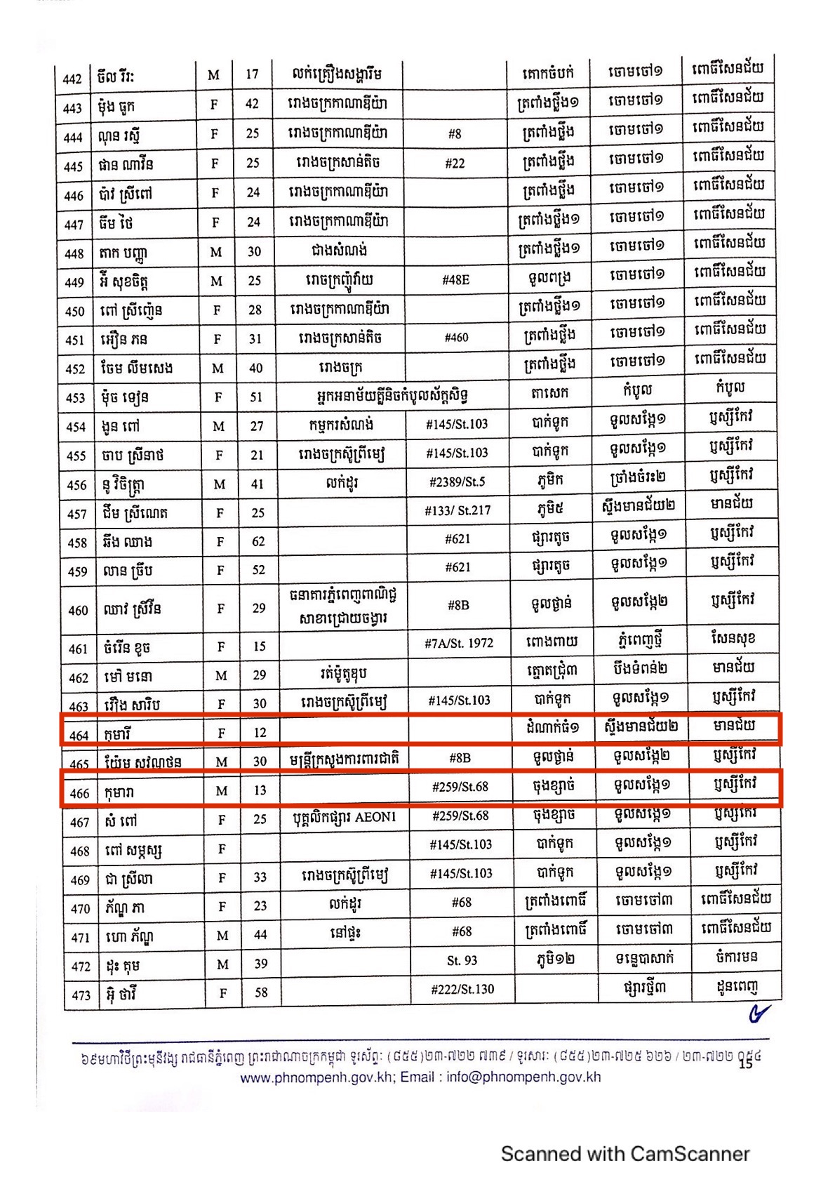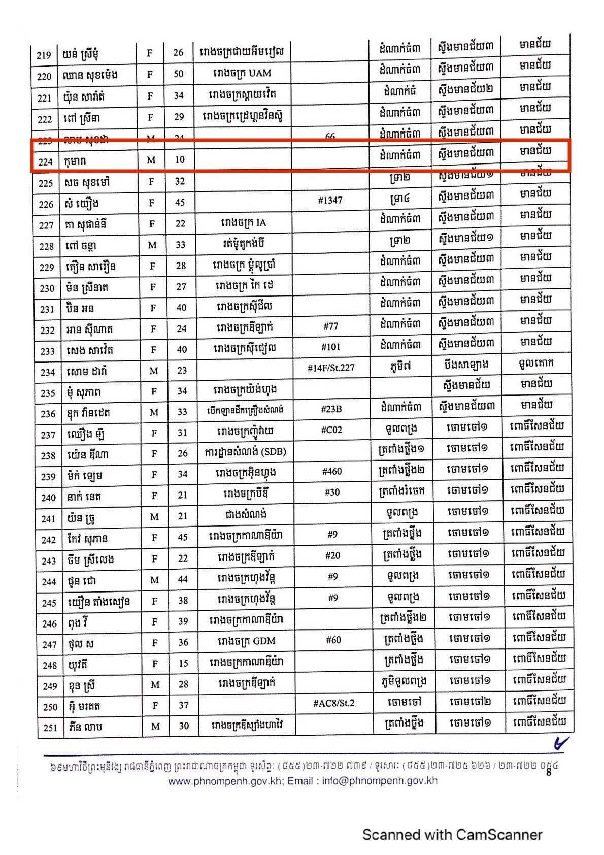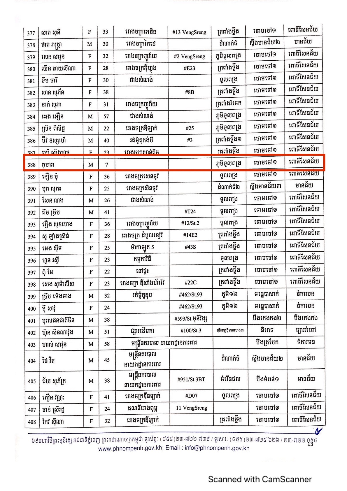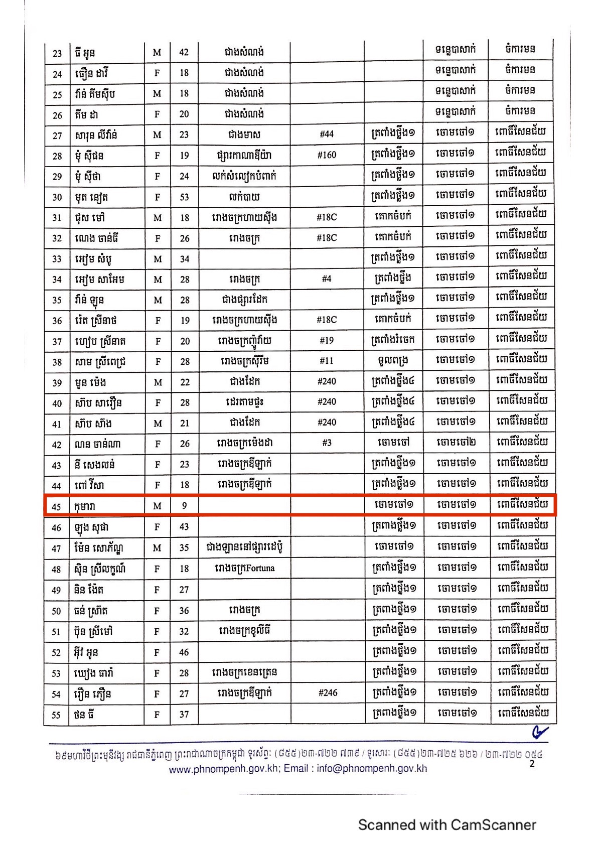 នាល្ងាចថ្ងៃទី៦ ខែឧសភា ឆ្នាំ២០២១ រដ្ឋបាលរាជធានីភ្នំពេញ បានធ្វើការបង្ហាញអត្តសញ្ញាញរបស់អ្នកជំងឺកូវីដ១៩ នៅក្នុងរាជធានីភ្នំពេញ ចំនួន ៥៧៨នាក់ ហើយនៅក្នុងនោះផងដែរ ក៏មានកុមារតូចៗដែលបានឆ្លងកូវីដ១៩ រហូតដល់ទៅ៣៣នាក់ ដែលមានដូចខាងក្រោម៖