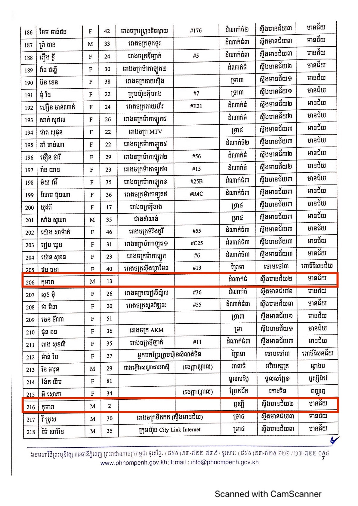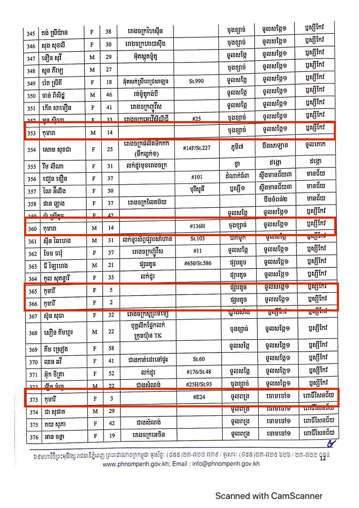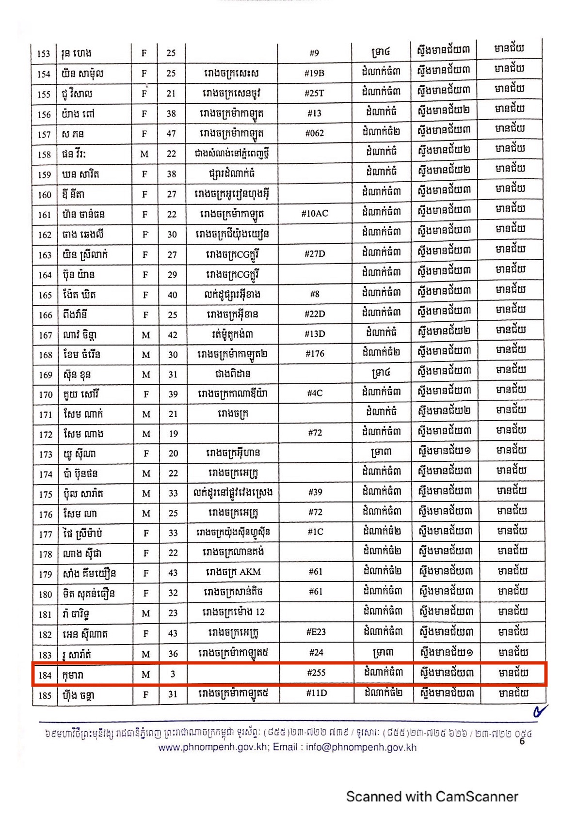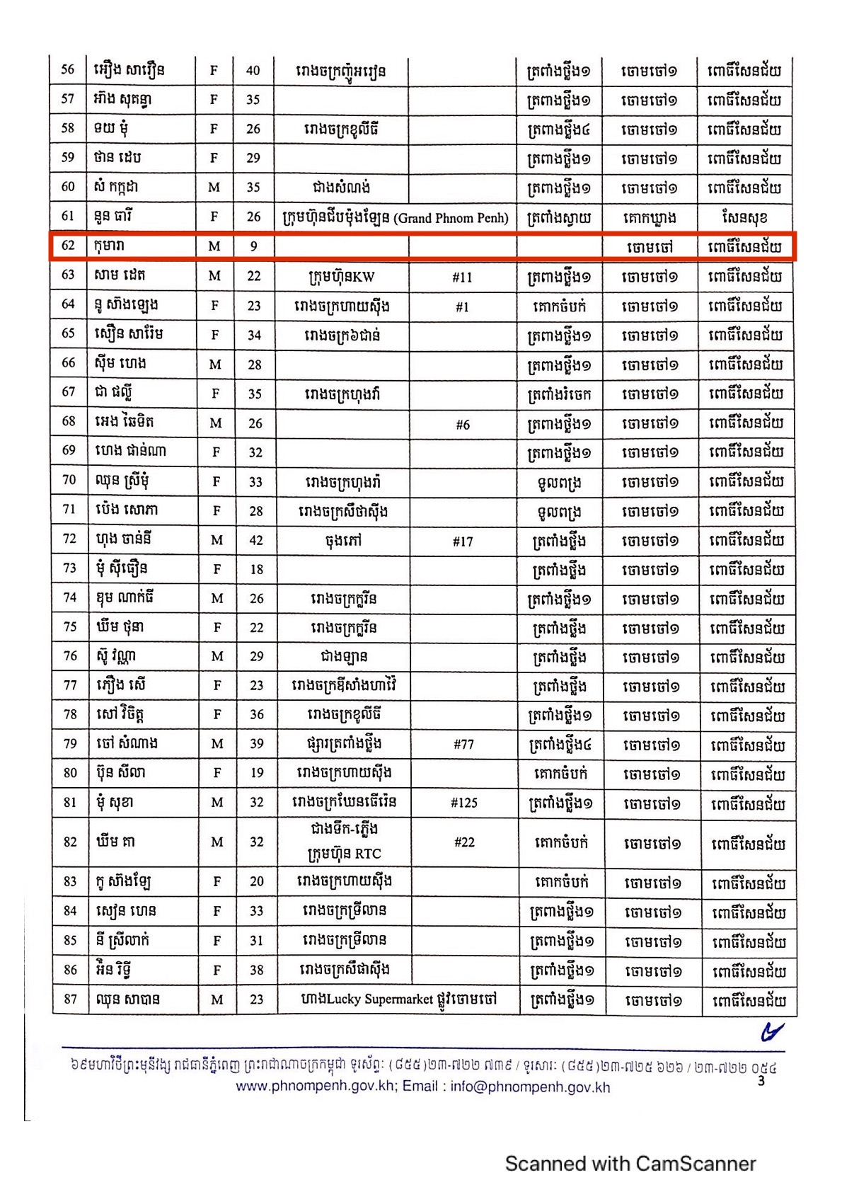 នាល្ងាចថ្ងៃទី៦ ខែឧសភា ឆ្នាំ២០២១ រដ្ឋបាលរាជធានីភ្នំពេញ បានធ្វើការបង្ហាញអត្តសញ្ញាញរបស់អ្នកជំងឺកូវីដ១៩ នៅក្នុងរាជធានីភ្នំពេញ ចំនួន ៥៧៨នាក់ ហើយនៅក្នុងនោះផងដែរ ក៏មានកុមារតូចៗដែលបានឆ្លងកូវីដ១៩ រហូតដល់ទៅ៣៣នាក់ ដែលមានដូចខាងក្រោម៖