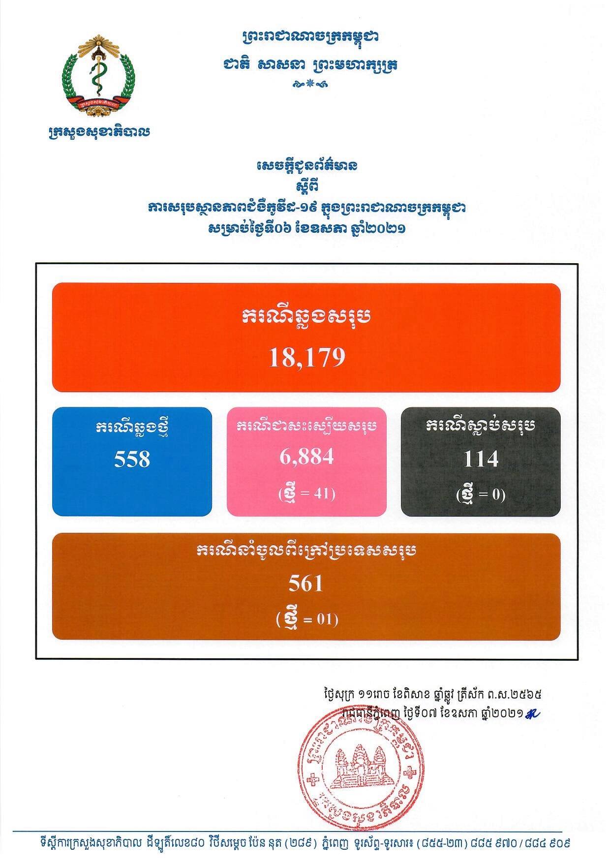 នៅថ្ងៃទី៧ ខែឧសភា ឆ្នាំ២០២១នេះ ក្រសួងសុខាភិបាលកម្ពុជា បានចេញសេចក្តីជូនដំណឹងពី ការរកឃើញករណីវិជ្ជមានវីរុសកូវីដ១៩ថ្មី ចំនួន ៥៥៨នាក់ ខណៈអ្នកបានជាសះស្បើយថ្មីមានចំនួន ៤១នាក់  ក្នុងនោះមានករណីនាំចូល០១នាក់ផងដែរ៕