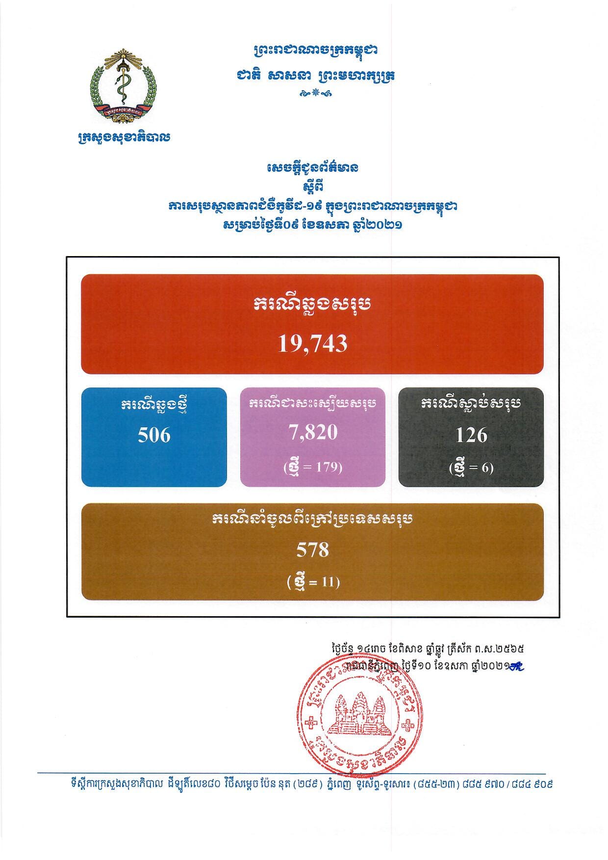 នៅថ្ងៃទី១០ ខែឧសភា ឆ្នាំ២០២១នេះ ក្រសួងសុខាភិបាលកម្ពុជា បានចេញសេចក្តីជូនដំណឹងពី ការរកឃើញករណីវិជ្ជមានវីរុសកូវីដ១៩ថ្មី ចំនួន ៥០៦នាក់ ខណៈអ្នកបានជាសះស្បើយថ្មីមានចំនួន ១៧៩នាក់ និងបាត់បង់ជីវិត ៦នាក់ទៀត ក្នុងនោះមានករណីនាំចូល១១នាក់ផងដែរ៕