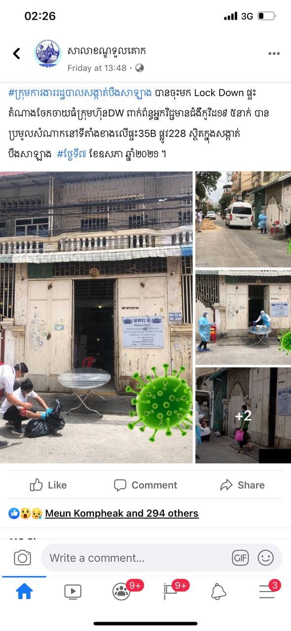 ប្រិយមិត្តជាច្រើនប្រាកដជាដឹងហើយ ស្ថានភាពនៃការរីករាលដាលជំងឺកូវីដ១៩ក្នុងព្រឹត្តការណ៍ ២០កុម្ភៈនៅតែមិនទាន់ ហើយរដ្ឋាភិបាលក៏បានបន្តខិតខំទប់ស្កាត់នៃការរីករាលដាលជំងឺកូវីដ១៩ ហើយក៏បានបែងចែកតំបន់ក្រហម លឿង និងលឿងទុំ នេះជាវីធានការដ៏ល្អបំផុតសំរាប់បងប្អូនប្រជាជនខ្មែរ ដើម្បីកុំឲ្យមានការរីករាលដាលបន្តទៅទៀត ពលរដ្ឋជាច្រើនក៏ថ្លែងអំណរអរគុណដល់រាជរដ្ឋាភិបាលដែលតែងតែជួយប្រជាជនកន្លែងតំបន់ក្រហម។