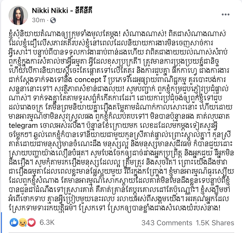 “ខ្ញុំសុំនិយាយតំណាងឲ្យក្រុមទាំងមូលតែម្ដង! សំណាងណាស់! ពិតជាសំណាងណាស់ដែលខ្ញុំជឿលើសភាវគតិរបស់ខ្ញុំនៅពេលដែលនិយាយការងារមិនចេញសាច់ការអ្វីសោះ។ បន្ទាប់ពីបានទទួលការងាររាប់ពាន់ដងហើយ វាពិតជាងាយយល់ណាស់សំរាប់ពួកខ្ញុំក្នុងការសំគាល់ថាអ្វីធម្មតា អ្វីដែលខុសប្រក្រតី។ ត្រូវមានការប្រុងប្រយត្ន័ជានិច្ច ហើយបើការនិយាយស្ដីចេះតែផ្ដោតទៅលើតែតួរ និងការជួបគ្នា ផឹកកាហ្វេ ជាងការងារជាក់ស្ដែងទាក់ទងទៅនឹង concept រឺ ប្រភេទវីដេអូផ្សាយពាណិជ្ជកម្ម គួរបោះបង់ការសន្ទនានោះទៅ។ សុវត្ថិភាពសំខាន់ជាងលុយ! សូមបញ្ជាក់ ពួកខ្ញុំកម្រជួបភ្ញៀវប្រជុំផ្ទាល់ណាស់។ ទាក់ទងគ្នាតែតាមទូរសព័្ទក៏កើតការដែរ។ ដោយការប្រជុំចង់ឲ្យពួកខ្ញុំទៅជួបដល់រោងចក្រ តែមិនព្រមនិយាយគ្នារឿងតម្លៃតាមដំណាក់កាលសោះនោះ ហើយដោយមានអារម្មណ៍ថាមិនសូវស្រួលផង ពួកខ្ញុំក៏ឈប់តបទៅ។ មិនបានប៉ុន្មានផង គាត់លុបឆាត telegram ចោលអស់រលីង។ ប៉ុន្មានខែក្រោយមក លេខដដែលមកម្ដងទៀតសួរអ្វីចម្លែកៗ។ ឆ្ងល់ពេកខ្ញុំក៏បានទៅនិយាយជាមួយកូនស្រីគាត់ផ្ទាល់ព្រោះស្គាល់គ្នា។ កូនស្រីគាត់ដោយជាមនុស្សមានចំណេះដឹង មនុស្សល្អ និងមនុស្សមានសុជីវធម៌ ក៏បានជួយដោះស្រាយបញ្ហាយ៉ាងលឿនបំផុត។ សូមបែងចែកឲ្យដាច់រវាងអ្នកប្រព្រឹត្ត និងអ្នកជួយ រឺអ្នកមិនដឹងរឿង។ សូមកុំតាមរករឿងមនុស្សដែលល្អ ត្រឹមត្រូវ និងសុចរិត។ ព្រោះយើងដឹងថាវាជារឿងធម្មតាដែលពេលខ្លះមានផ្លែស្អុយមួយ រឺពីរក្នុងកញ្ច្រែង។ ខ្ញុំមានអារម្មណ៍ធូរស្បើយដែលពួកខ្ញុំសំណាង តែមានអារម្មណ៍សោកស្ដាយដែលគាត់មិនមែនដឹងខ្លួនទេបន្ទាប់ពីខ្ញុំបានជូនជាដំណឹងទៅគ្រួសារគាត់ គឺគាត់គ្រាន់តែប្ដូរគោលដៅតែប៉ុណ្ណោះ។ ខ្ញុំសង្ឃឹមថាអំពើថោកទាប គ្មានអ្វីប្រៀបមួយនេះរលុប រលាយអស់ពីសង្គមយើង។ អរគុណអ្នកដែលស្រែកទាមទាររកយុត្តិធម៌។ ស្រែកទៅ ស្រែកឲ្យបានខ្លាំងជាងសំលេងយំរបស់នាង!”