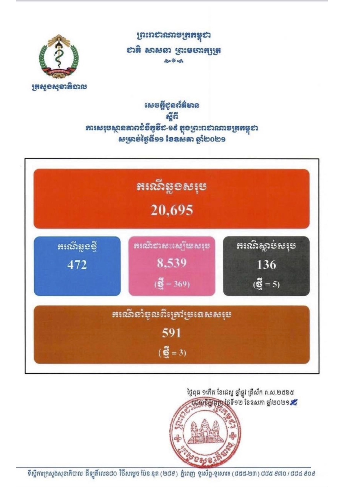 ថ្ងៃនេះ ក្រសួងបន្តរកឃើញអ្នកកើតកូវីដ ចំនួន ៤៧២នាក់បន្ថែមទៀត ខណៈជាសះស្បើយចំនួន ៣៦៩នាក់ និងបាត់បង់ជីវិត ៥នាក់