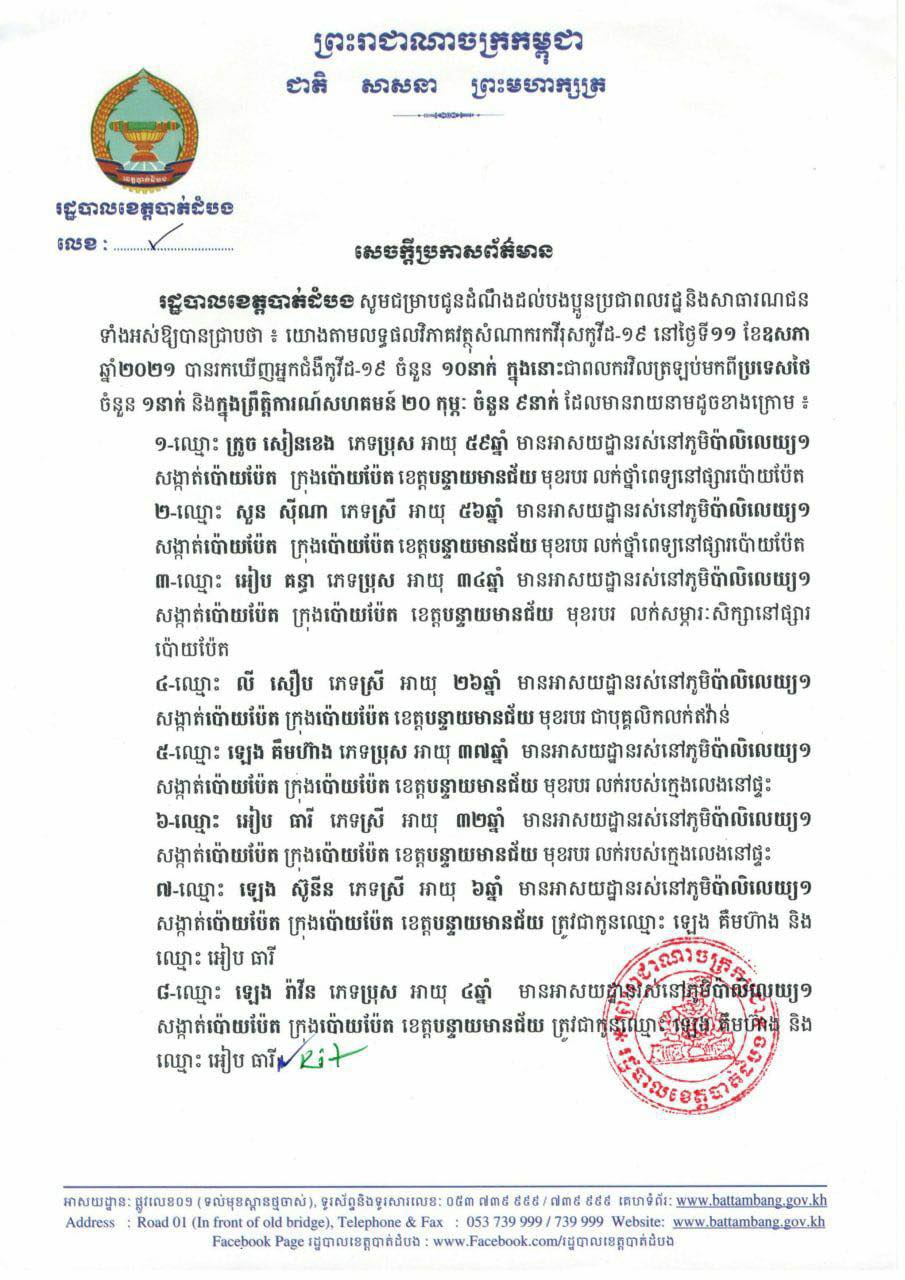 ខេត្តបាត់ដំបង រកឃើញអ្នកជំងឺកូវីដ១៩ ចំនួន១០នាក់ទៀត ក្នុងនោះមានទារកអាយុ១ឆ្នាំម្នាក់ផងដែរ