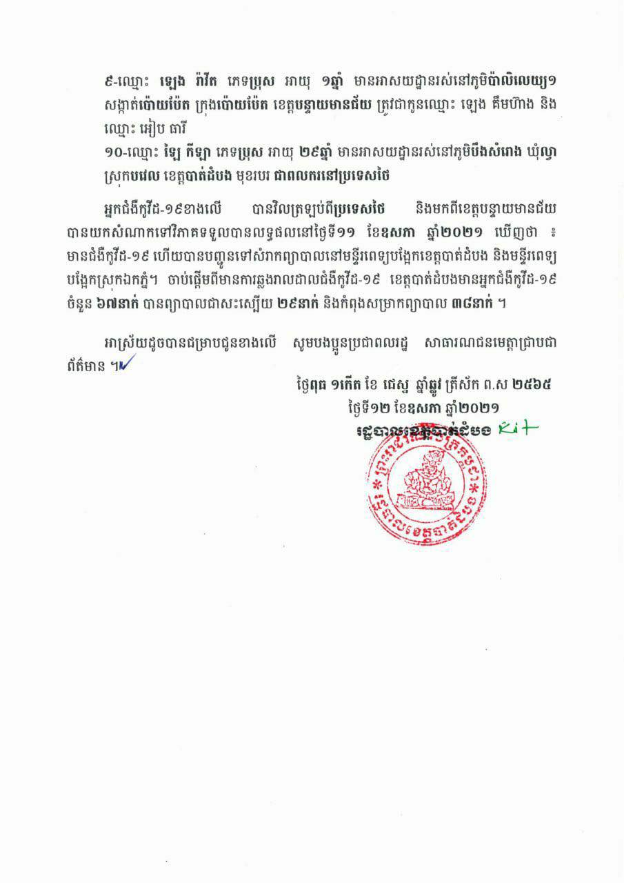 យោងតាមលទ្ធផលវិភាគវត្ថុសំណាករកវីរុសកូវិដ១៩ នៅថ្ងៃទី១១ ខែឧសភា ឆ្នាំ២០២១ បានរកឃើញអ្នកជំងឺកូវីដ១៩ ចំនួន១០នាក់ ក្នុងនោះជាពលករវិលត្រឡប់មកពីប្រទេសថៃ ចំនួន១នាក់ និងក្នុងព្រឹត្តិការណ៍សហគមន៍ ២០កុម្ភៈ ចំនួន ៩នាក់ ដែលមានរាយនាមដូចខាងក្រោម៖