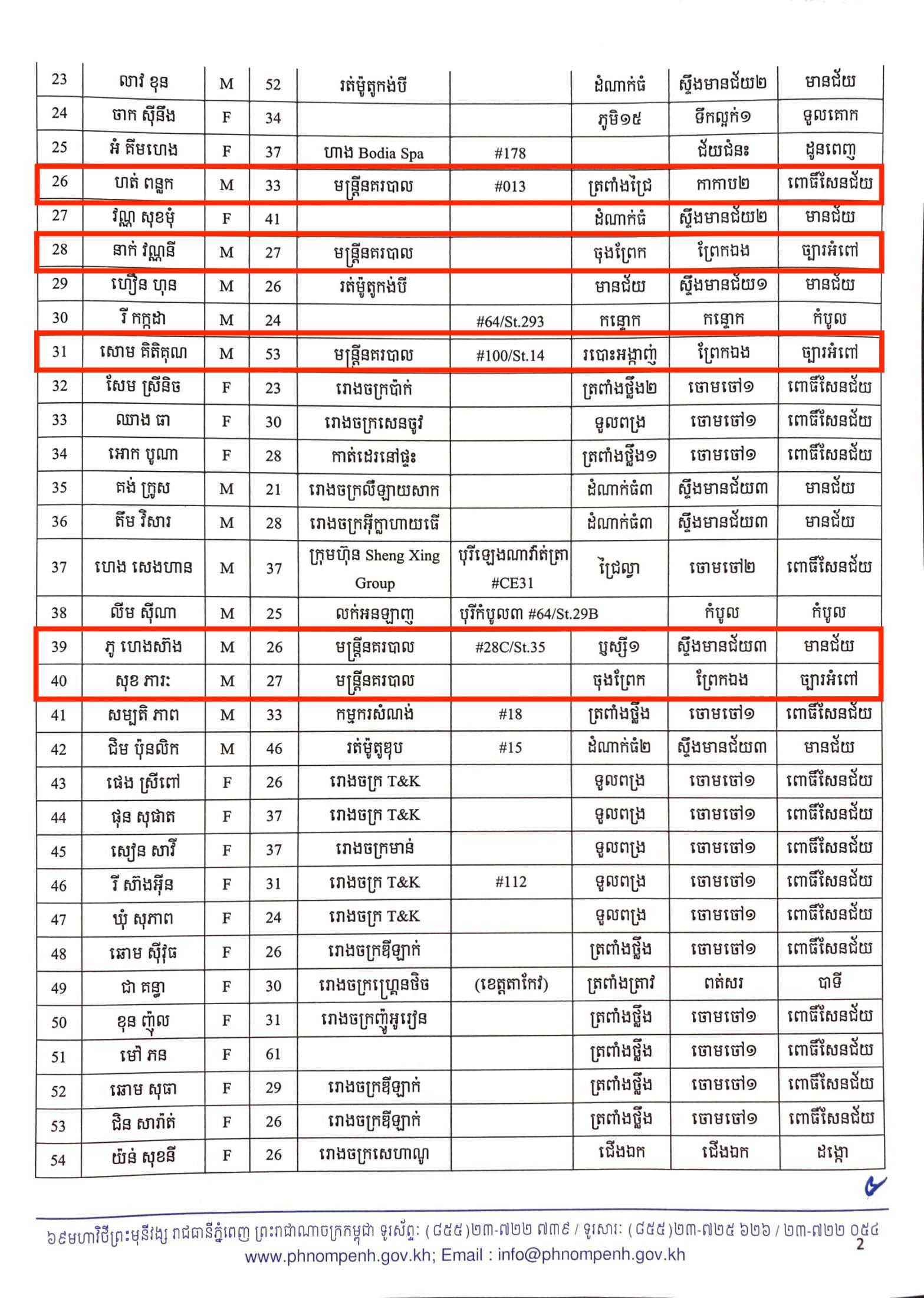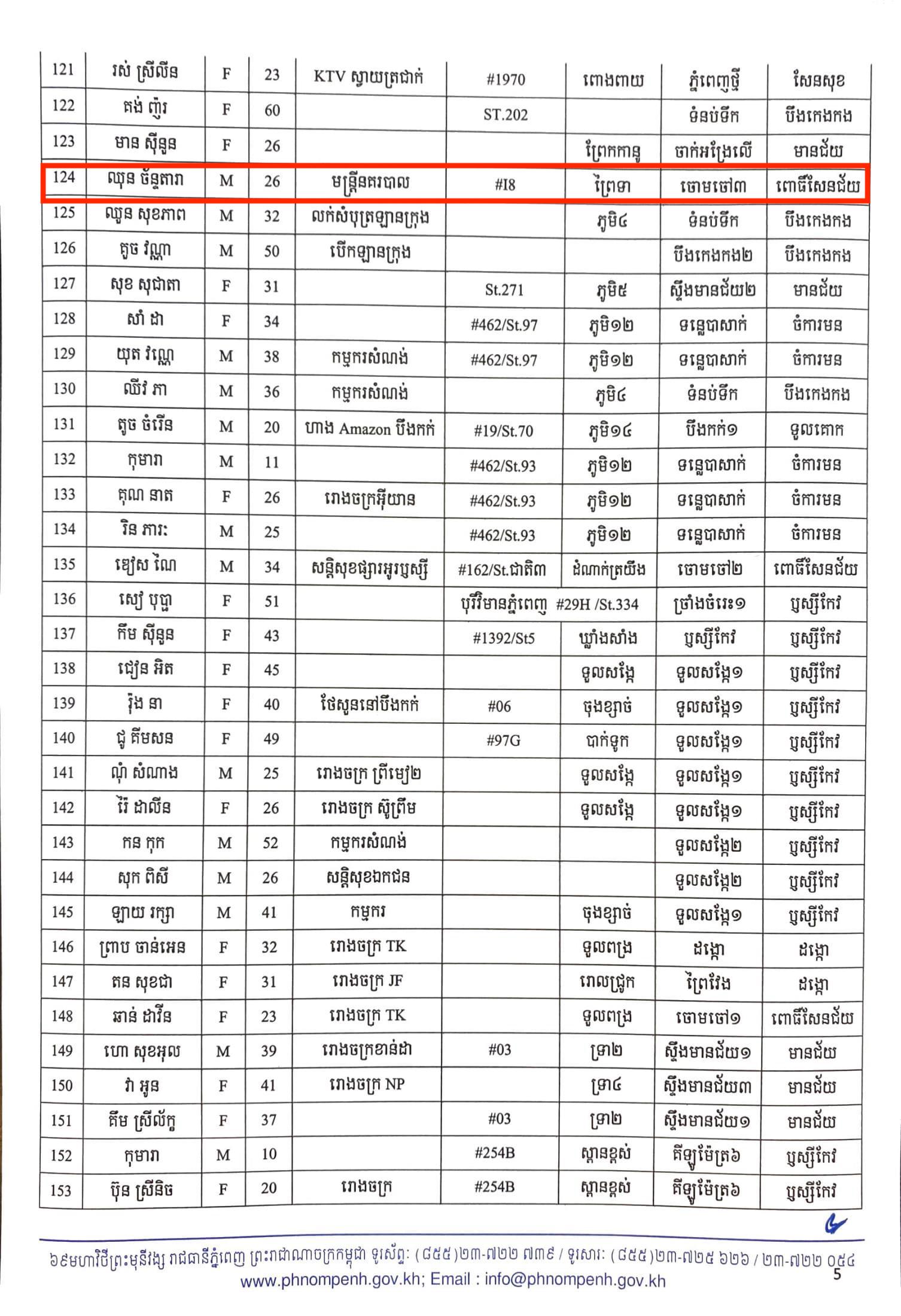 អ្នកជំងឺកូវីដ ដែលរដ្ឋបាលរាជធានីភ្នំពេញបង្ហាញអត្តសញ្ញាណថ្ងៃនេះ មានមន្ត្រីនគរបាលចំនួន ៧នាក់បានឆ្លងកូវីដ