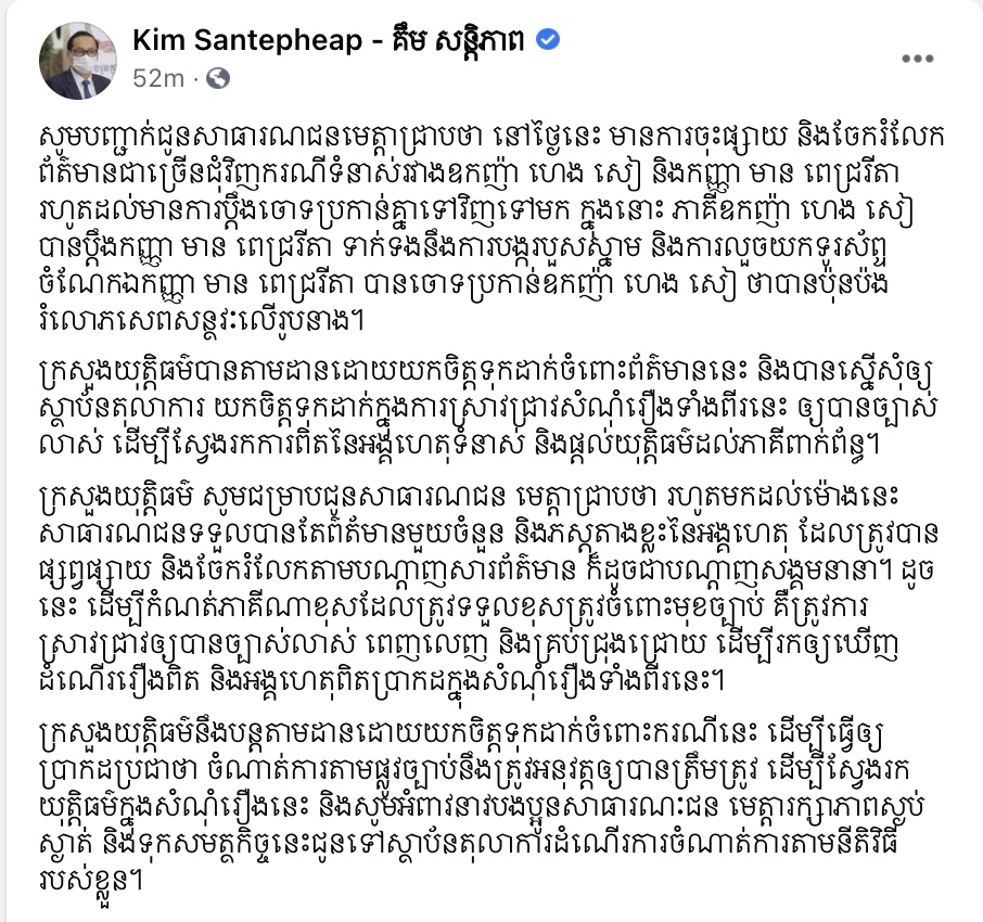 “សូមបញ្ជាក់ជូនសាធារណជនមេត្តាជ្រាបថា នៅថ្ងៃនេះ មានការចុះផ្សាយ និងចែករំលែកព័ត៌មានជាច្រើនជុំវិញករណីទំនាស់រវាងឧកញ៉ា ហេង សៀ និងកញ្ញា មាន ពេជ្ររីតា រហូតដល់មានការប្តឹងចោទប្រកាន់គ្នាទៅវិញទៅមក ក្នុងនោះ ភាគីឧកញ៉ា ហេង សៀ បានប្តឹងកញ្ញា មាន ពេជ្ររីតា ទាក់ទងនឹងការបង្ករបួសស្នាម និងការលួចយកទូរស័ព្ទ ចំណែកឯកញ្ញា មាន ពេជ្ររីតា បានចោទប្រកាន់ឧកញ៉ា ហេង សៀ ថាបានប៉ុនប៉ងរំលោភសេពសន្ថវៈលើរូបនាង។ ក្រសួងយុត្តិធម៌បានតាមដានដោយយកចិត្តទុកដាក់ចំពោះព័ត៌មាននេះ និងបានស្នើសុំឲ្យស្ថាប័នតុលាការ យកចិត្តទុកដាក់ក្នុងការស្រាវជ្រាវសំណុំរឿងទាំងពីរនេះ ឲ្យបានច្បាស់លាស់ ដើម្បីស្វែងរកការពិតនៃអង្គហេតុទំនាស់ និងផ្តល់យុត្តិធម៌ដល់ភាគីពាក់ព័ន្ធ។ ក្រសួងយុត្តិធម៌ សូមជម្រាបជូនសាធារណជន មេត្តាជ្រាបថា រហូតមកដល់ម៉ោងនេះ សាធារណជនទទួលបានតែព៌ត័មានមួយចំនួន និងភស្តុតាងខ្លះនៃអង្គហេតុ ដែលត្រូវបានផ្សព្វផ្សាយ និងចែករំលែកតាមបណ្តាញសារព័ត៌មាន ក៏ដូចជាបណ្តាញសង្គមនានា។ ដូចនេះ ដើម្បីកំណត់ភាគីណាខុសដែលត្រូវទទួលខុសត្រូវចំពោះមុខច្បាប់ គឺត្រូវការស្រាវជ្រាវឲ្យបានច្បាស់លាស់ ពេញលេញ និងគ្រប់ជ្រុងជ្រោយ ដើម្បីរកឲ្យឃើញដំណើររឿងពិត និងអង្គហេតុពិតប្រាកដក្នុងសំណុំរឿងទាំងពីរនេះ។ ក្រសួងយុត្តិធម៌នឹងបន្តតាមដានដោយយកចិត្តទុកដាក់ចំពោះករណីនេះ ដើម្បីធ្វើឲ្យប្រាកដប្រជាថា ចំណាត់ការតាមផ្លូវច្បាប់នឹងត្រូវអនុវត្តឲ្យបានត្រឹមត្រូវ ដើម្បីស្វែងរកយុត្តិធម៌ក្នុងសំណុំរឿងនេះ និងសូមអំពាវនាវបងប្អូនសាធារណៈជន មេត្តារក្សាភាពស្ងប់ស្ងាត់ និងទុកសមត្ថកិច្ចនេះជូនទៅស្ថាប័នតុលាការដំណើរការចំណាត់ការតាមនីតិវិធីរបស់ខ្លួន។”