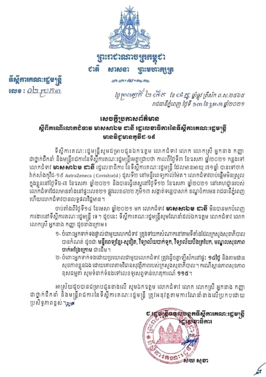 នៅថ្ងៃទី១៣ ខែឧសភា ឆ្នាំ២០២១នេះ ទីស្តីការគណៈរដ្ឋមន្ត្រី បានបញ្ជាក់ថា កន្លងទៅ លោកជំទាវ មាសសាឯម ដានី រដ្ឋលេខាធិការ នៃទីស្តីការគណៈរដ្ឋមន្ត្រី ដែលមានអាយុ៧១ឆ្នាំ បានទៅចាក់វ៉ាក់សាំងកូវីដ-១៩ AstraZeneca (Covishield) ដូសទី២ នៅមន្ទីរពេទ្យកាល់ម៉ែត។ លោកជំទាវចាប់ផ្ដើមមិនស្រួលក្នុងខ្លួននៅថ្ងៃទី៦-៧ ខែឧសភា ឆ្នាំ២០២១ និងបានធ្វើតេស្តនៅថ្ងៃទី១២ ខែឧសភា ឆ្នាំ២០២១ នៅគេហដ្ឋានរបស់លោកជំទាវ ដែលមានតាំងនៅផ្ទះលេខ២១ ផ្លូវលេខ៤២២ ភូមិ១៣ សង្កាត់ទន្លេបាសាក់ ខណ្ឌចំការមន រាជធានីភ្នំពេញ ហើយលោកជំទាវបានលទ្ធផលវិជ្ជមាន។