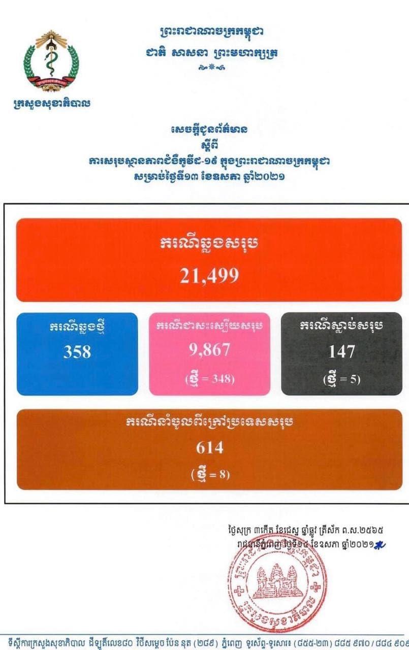 គួរបញ្ជាក់ផងដែរថា ក្រសួងសុខាភិបាល នៅថ្ងៃទី១៤ ខែឧសភា ឆ្នាំ២០២១នេះ បានចេញសេចក្តីជូនដំណឹងពី ការរកឃើញករណីវិជ្ជមានវីរុសកូវីដ១៩ថ្មី ៣៥៨ចំនួន នាក់ ខណៈអ្នកបានជាសះស្បើយថ្មីមានចំនួន ៣៤៨នាក់ និងបាត់បង់ជីវិត៥នាក់ទៀត៕