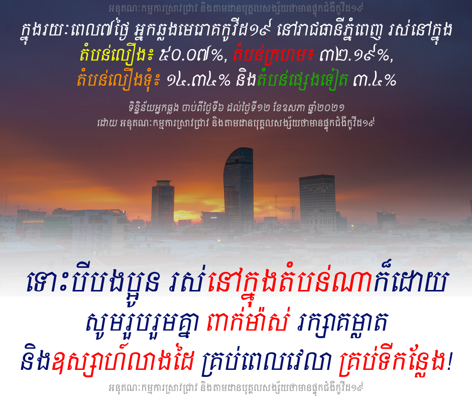 ចាប់ពីថ្ងៃទី៦ ដល់ថ្ងៃទី១២ ខែឧសភា ឆ្នាំ២០២១ ✅ អ្នកឆ្លង​​​មេរោគ #កូវីដ១៩ ថ្មី នៅ​ #រាជធានីភ្នំពេញ គឺជាប្រជាពលរដ្ឋដែលរស់នៅក្នុង