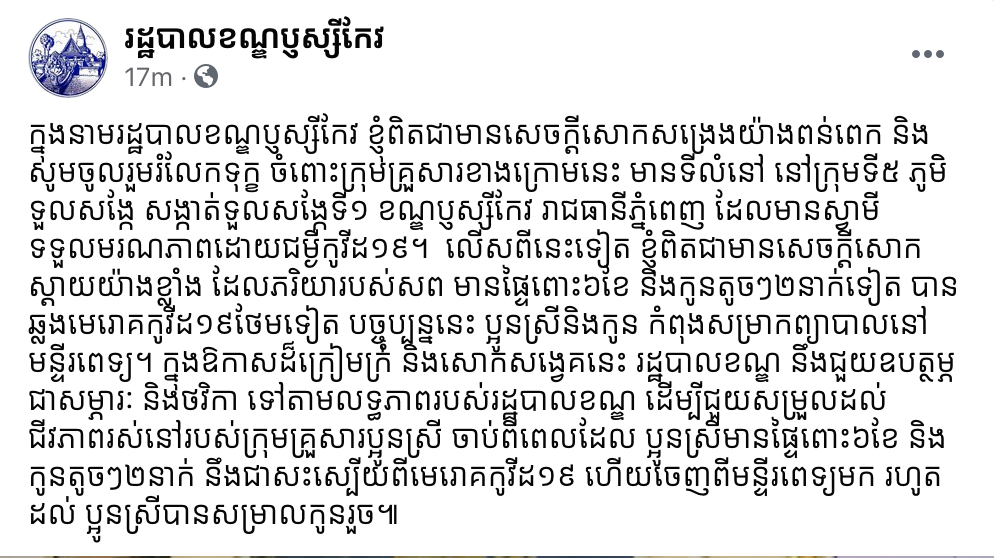 យោងតាមការបញ្ជាក់ពី រដ្ឋបាលខណ្ឌប្ញស្សីកែវ បានឲ្យដឹងថា ក្នុងនាមរដ្ឋបាលខណ្ឌប្ញស្សីកែវ ខ្ញុំពិតជាមានសេចក្ដីសោកសង្រេងយ៉ាងពន់ពេក និងសូមចូលរួមរំលែកទុក្ខ ចំពោះក្រុមគ្រួសារខាងក្រោមនេះ មានទីលំនៅ នៅក្រុមទី៥ ភូមិទួលសង្កែ សង្កាត់ទួលសង្កែទី១ ខណ្ឌប្ញស្សីកែវ រាជធានីភ្នំពេញ ដែលមានស្វាមីទទួលមរណភាពដោយជម្ងឺកូវីដ១៩។ លើសពីនេះទៀត ខ្ញុំពិតជាមានសេចក្ដីសោកស្ដាយយ៉ាងខ្លាំង ដែលភរិយារបស់សព មានផ្ទៃពោះ៦ខែ និងកូនតូចៗ២នាក់ទៀត បានឆ្លងមេរោគកូវីដ១៩ថែមទៀត បច្ចុប្បន្ននេះ ប្អូនស្រីនិងកូន កំពុងសម្រាកព្យាបាលនៅមន្ទីរពេទ្យ។
