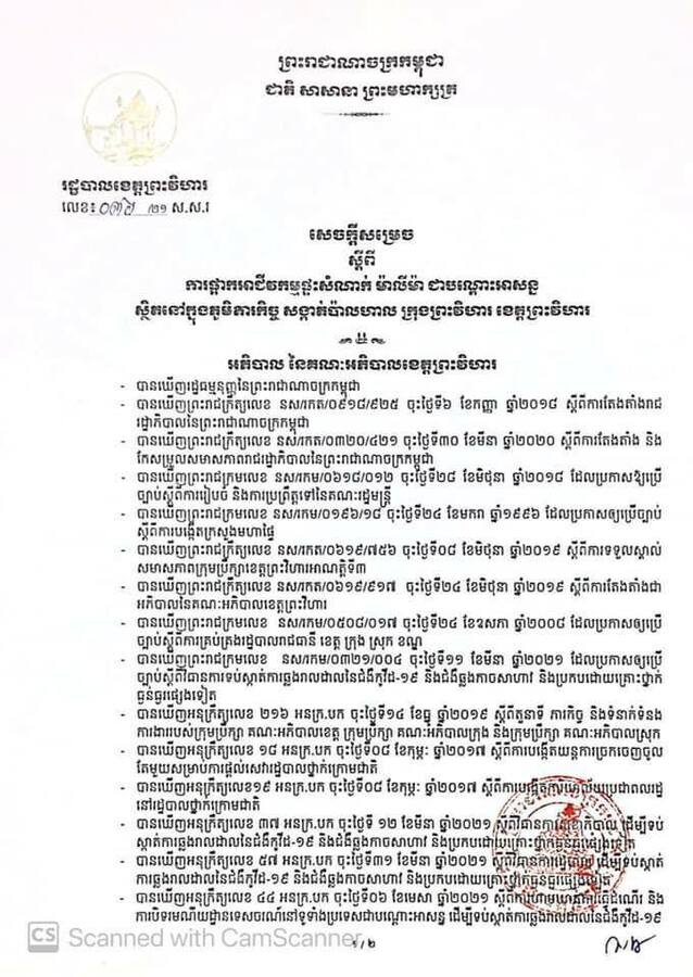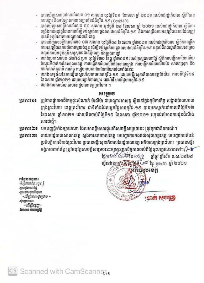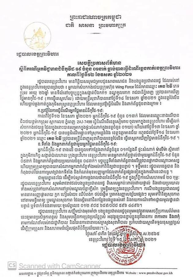 ជាមួយគ្នានោះរដ្ឋបាលខេត្ត បានអំពាវនាវដល់ប្រជាពលរដ្ឋ ដែលមានប្រវត្តិស្នាក់នៅ និងពិសារបាយ នៅផ្ទះសំណាកមាលីម៉ា និងតុបាយទល់មុខសាលាក្រុងព្រះវិហារ អញ្ជើញមកយកសំណាក និងធ្វើចត្តាឡីស័ក នៅតាមមណ្ឌលចត្តាឡីស័ក ឬទំនាក់ទំនង០១២ ៩៨៤ ៦៨៩/០៨៨ ៥៩៦ ៤៤៩៦ ៕