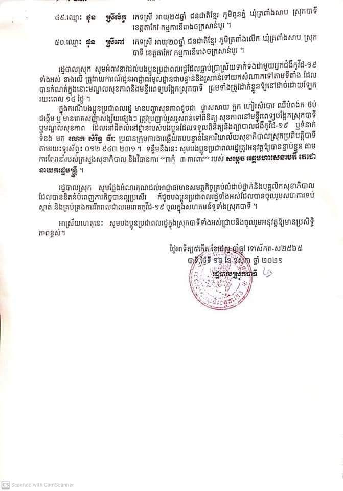 យោងតាមសេចក្តីជូនដំណឹងពីរដ្ឋបាលស្រុកបាទី ខេត្តតាកែវ បានធ្វើការចេញសេចក្តីជូនដំណឹងអំពីអត្តសញ្ញាណអ្នកមានលទ្ធផលវិជ្ជមានជំងឺកូវីដ១៩ ចំនួន៥០នាក់ (ស្រី ៣៩នាក់) ដែលជាករណីឆ្លងនៅក្នុងសហគមន៍ ២០កុម្ភៈ ដែលមានរាយនាមដូចខាងក្រោម។ រដ្ឋបាលស្រុក ក៏បានអំពាវនាវដល់បងប្អូនប្រជាពលរដ្ឋ ដែលធ្លាប់ប្រាស្រ័យទាក់ទងជាមួយនឹងអ្នកជំងឺ១៩ ទាំងអស់ ត្រូវរាយការណ៍ជូនអាជ្ញាធរមូលដ្ឋានជាបន្ទាន់ និងរួសរាន់ទៅយកសំណាកទៅតាមទីតាំង ដែលបានកំណត់ក្នុងនោះមណ្ឌលសុខភាព និងមន្ទីរពេទ្យបង្អែកស្រុកបាទី ព្រមទាំងត្រូវដាក់ខ្លួនឲ្យនៅដាច់ដោយឡែករយៈពេល១៤ថ្ងៃ៕