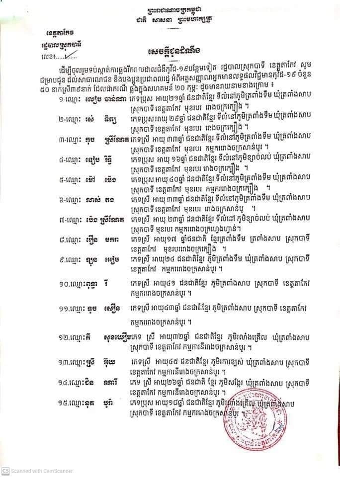 ខេត្តតាកែវ ធ្វើការបង្ហាញអត្តសញ្ញាណអ្នកជំងឺកូវីដ១៩ ចំនួន ៥០នាក់ នៅក្នុងស្រុកបាទី